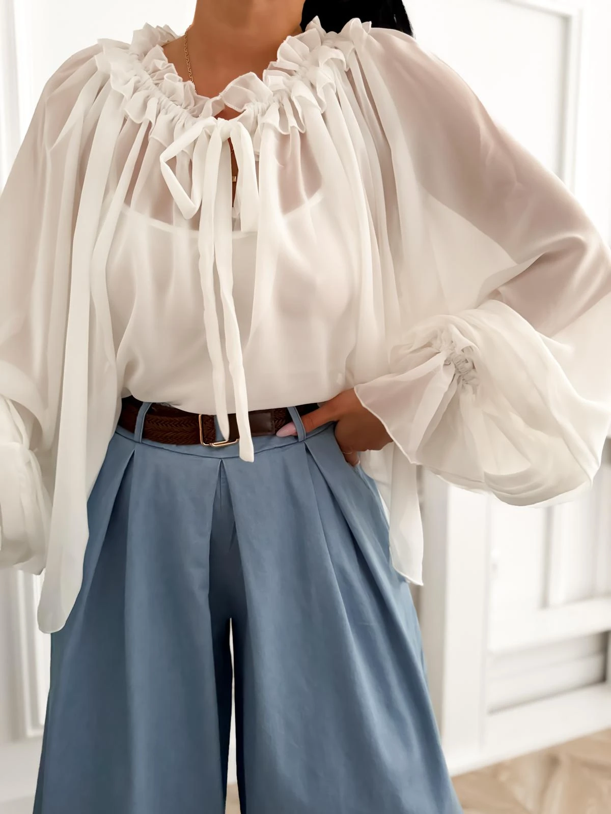 Biała, delikatna koszula mgiełka z falbankami i bufiastymi rękawami, New Collection, rozmiar uniwersalny