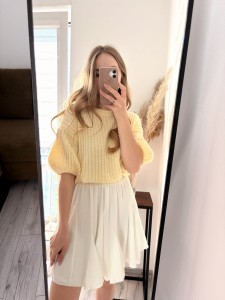 Modelka ma 171cm wzrostu i nosi rozmiar XS/S.