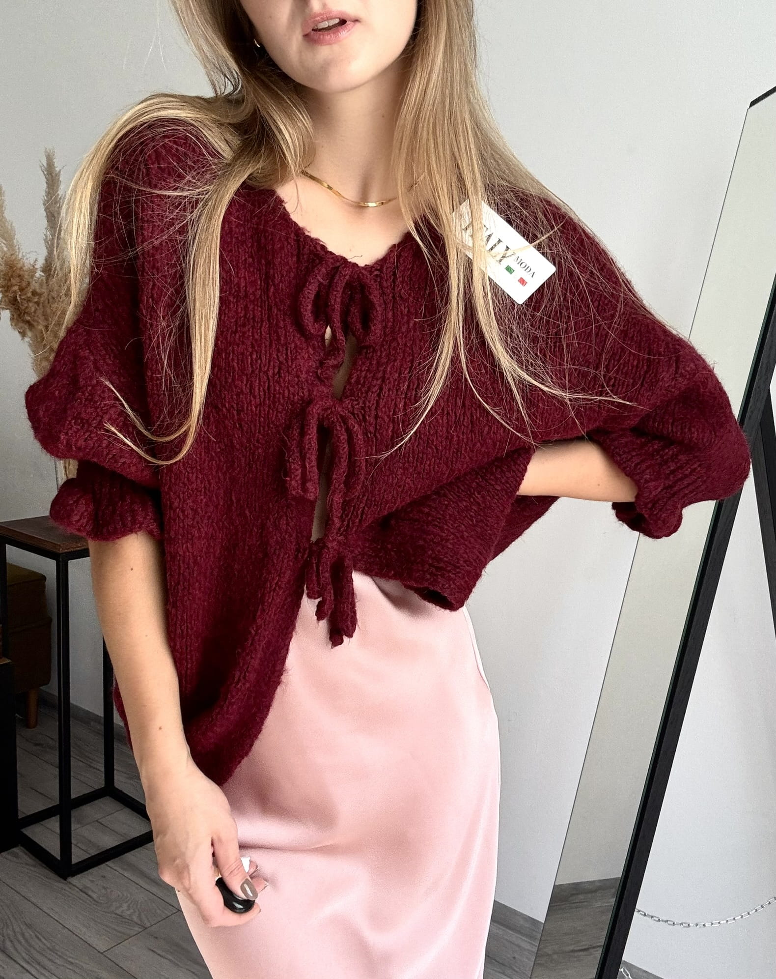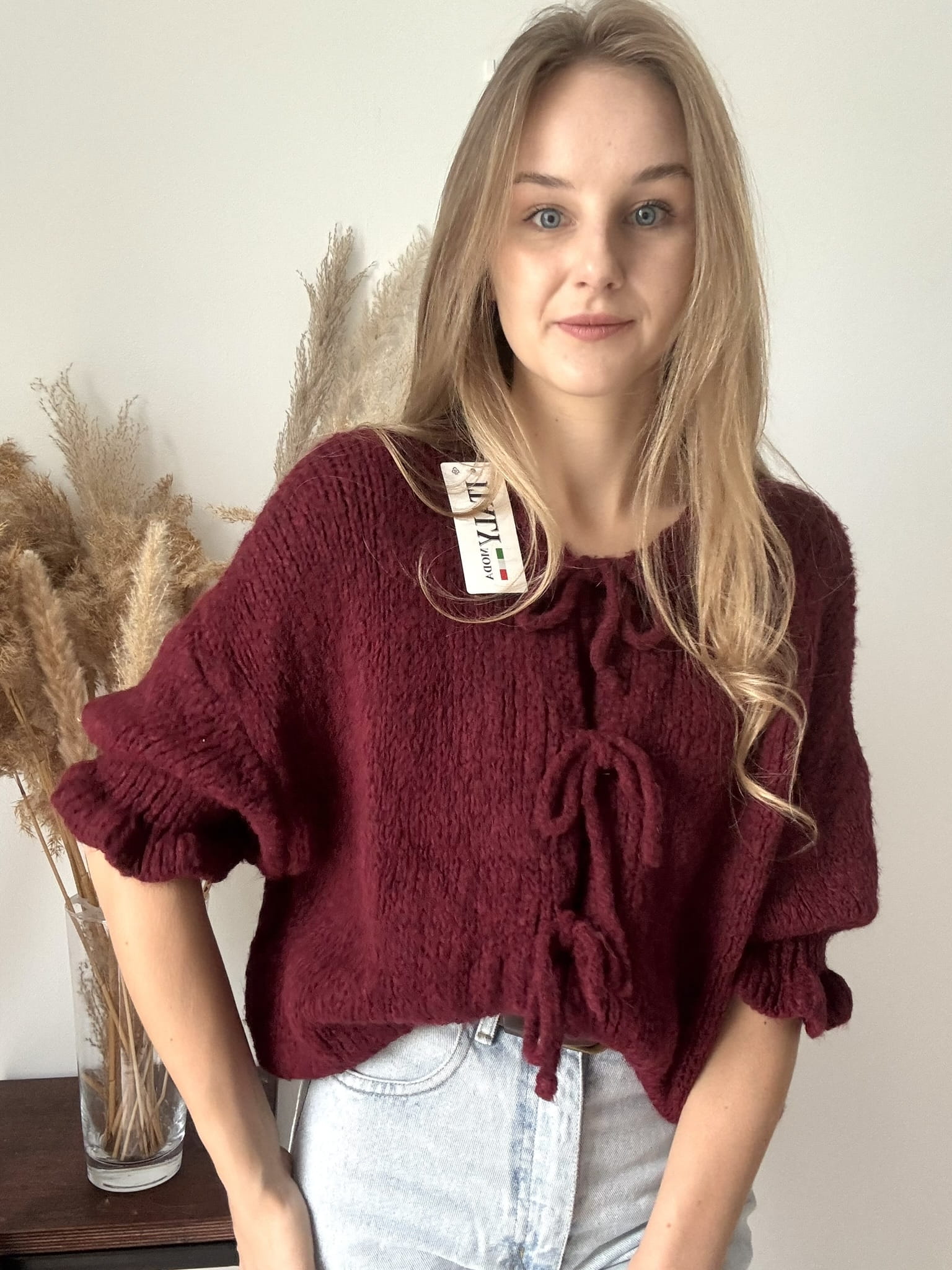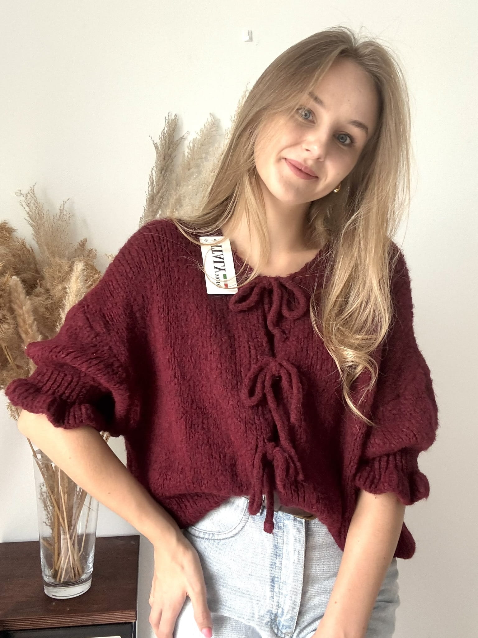 Bordowy sweterek kardigan z uroczymi kokardkami Italy Moda