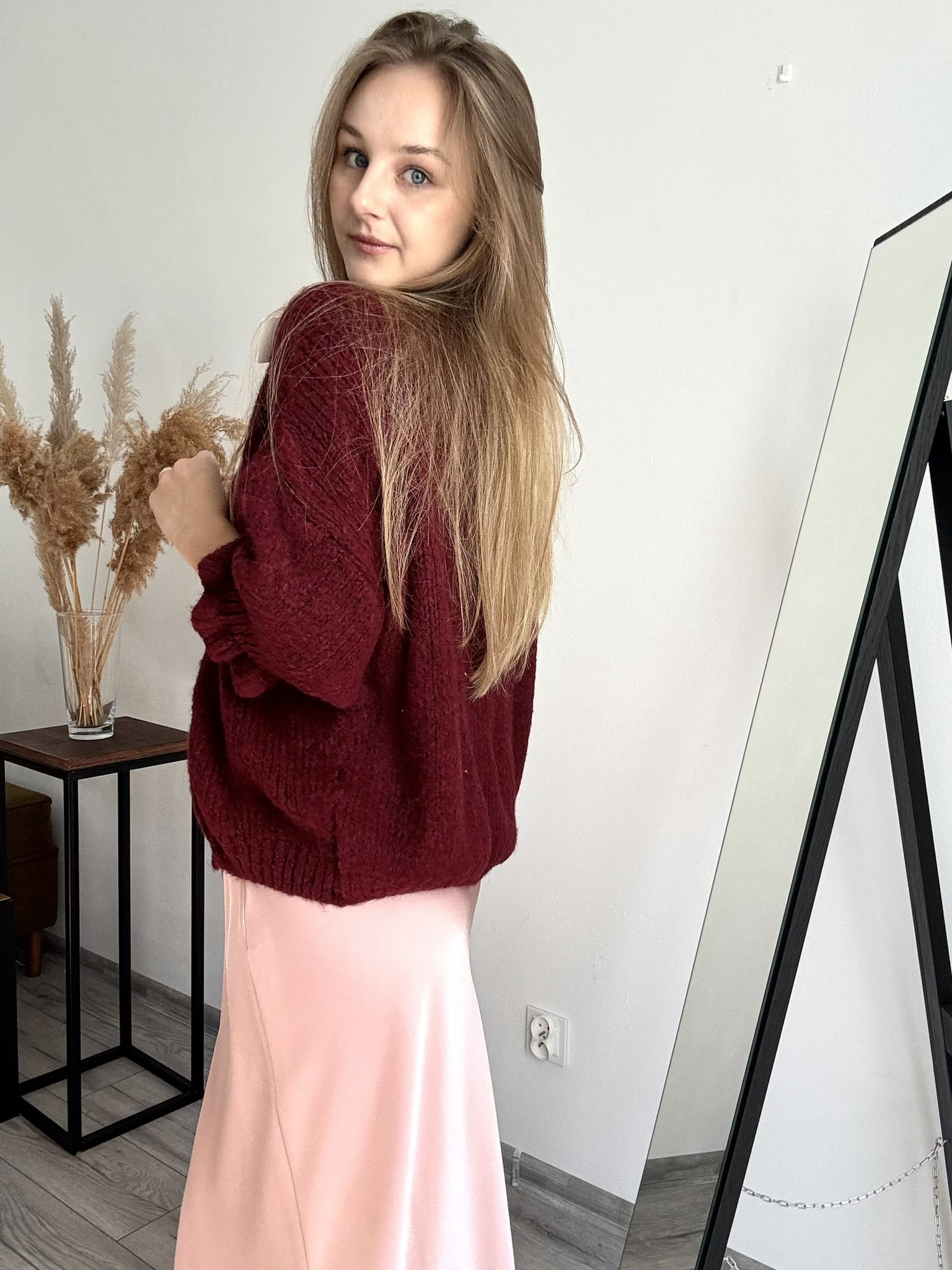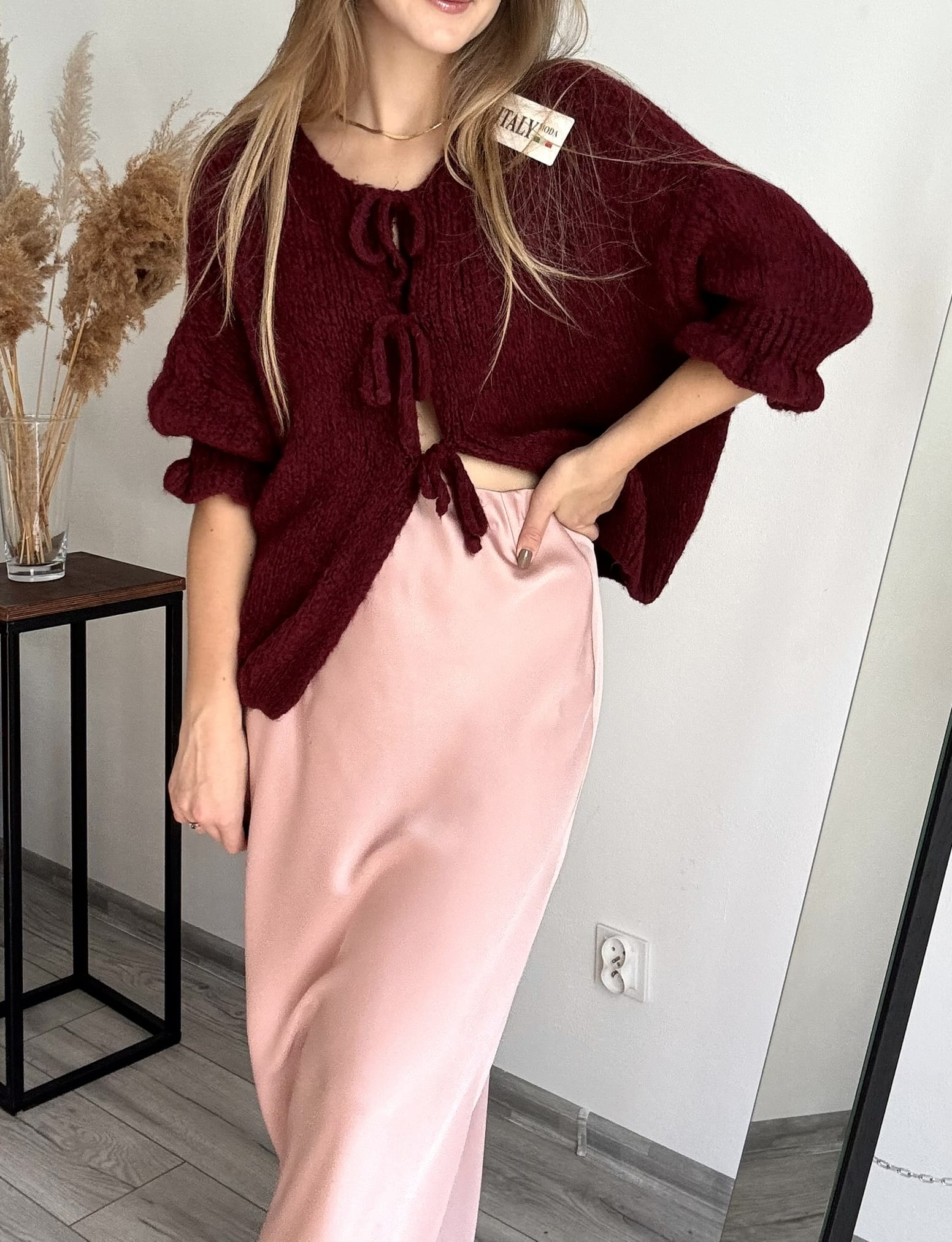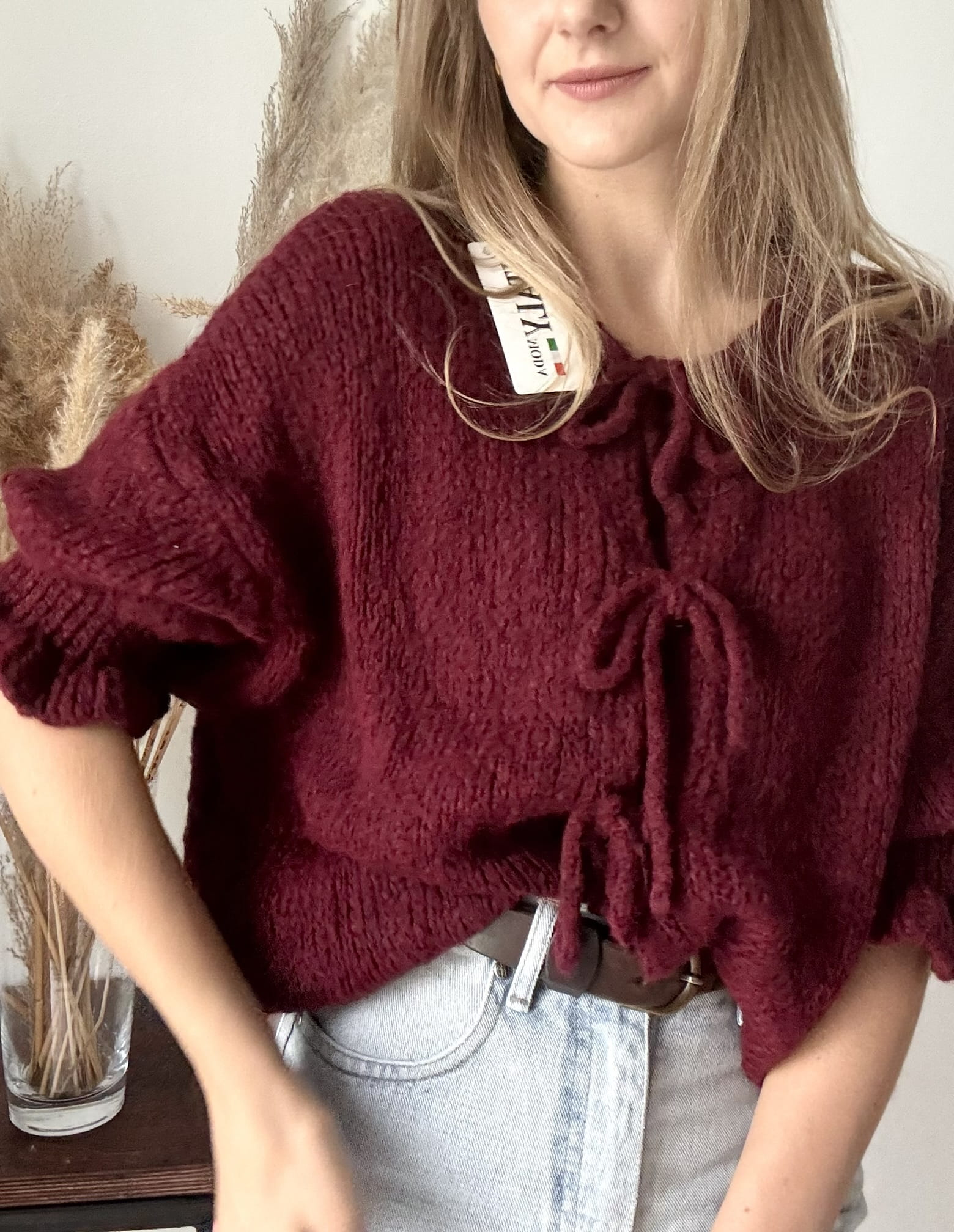 Bordowy sweterek kardigan z uroczymi kokardkami Italy Moda