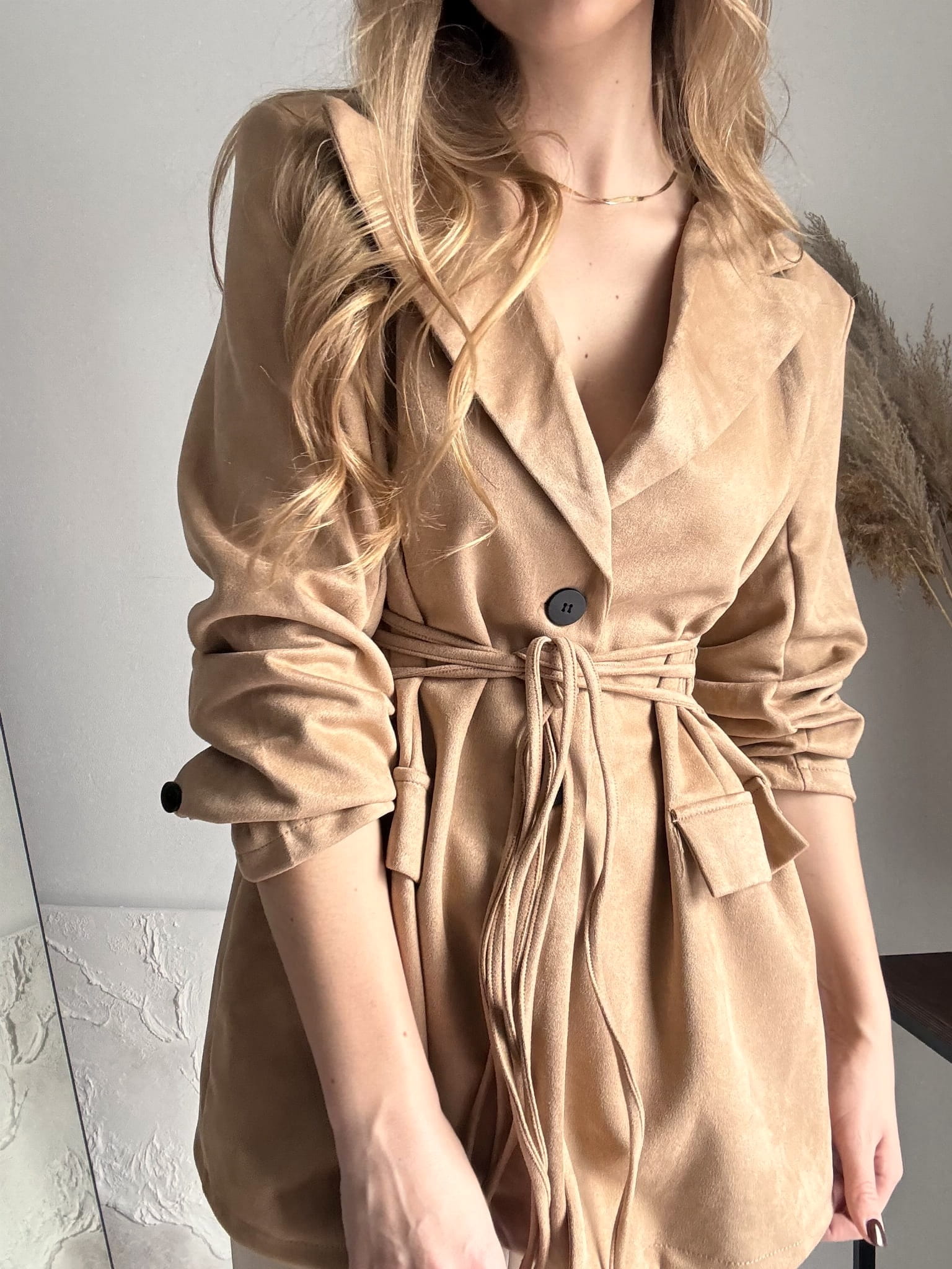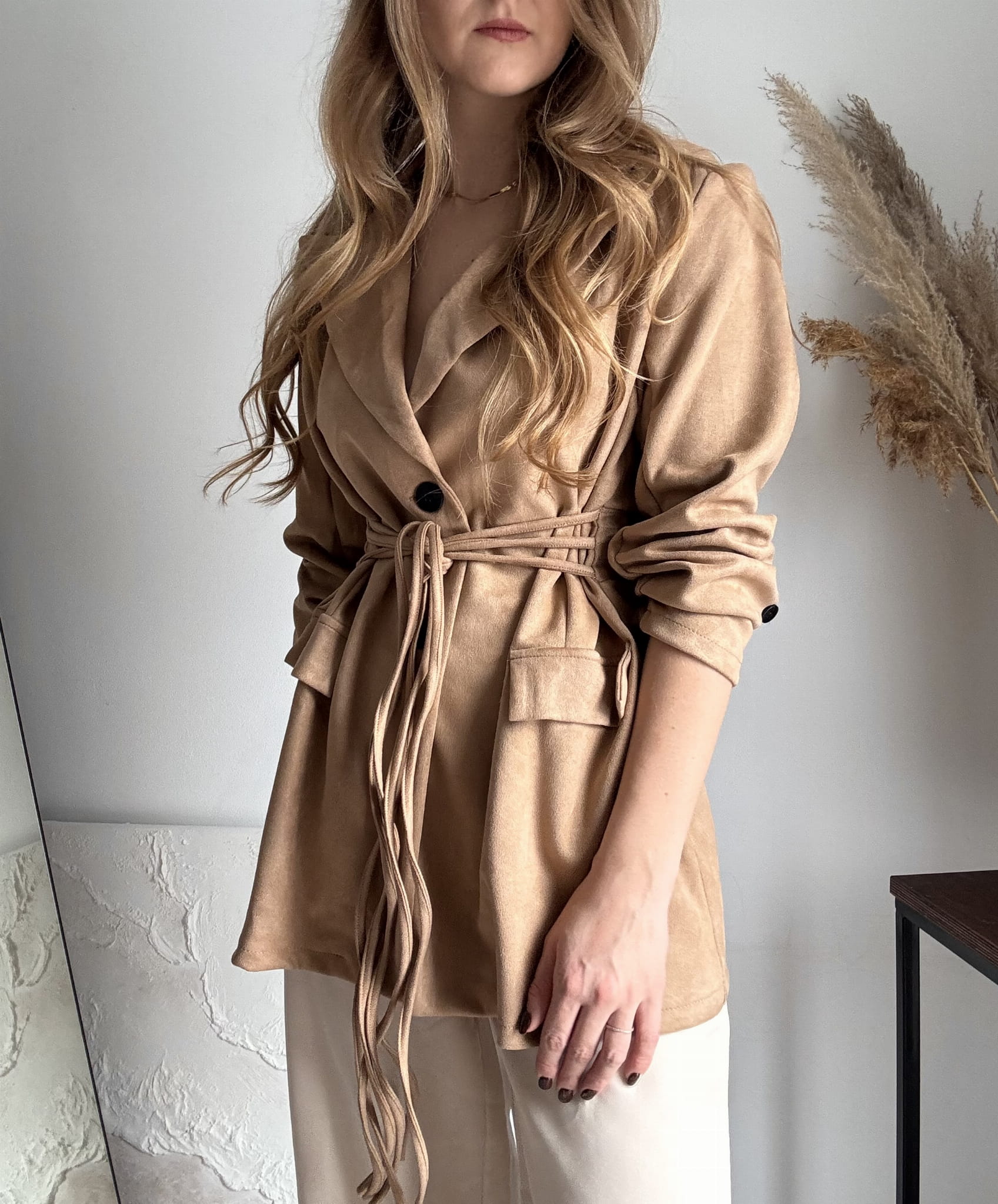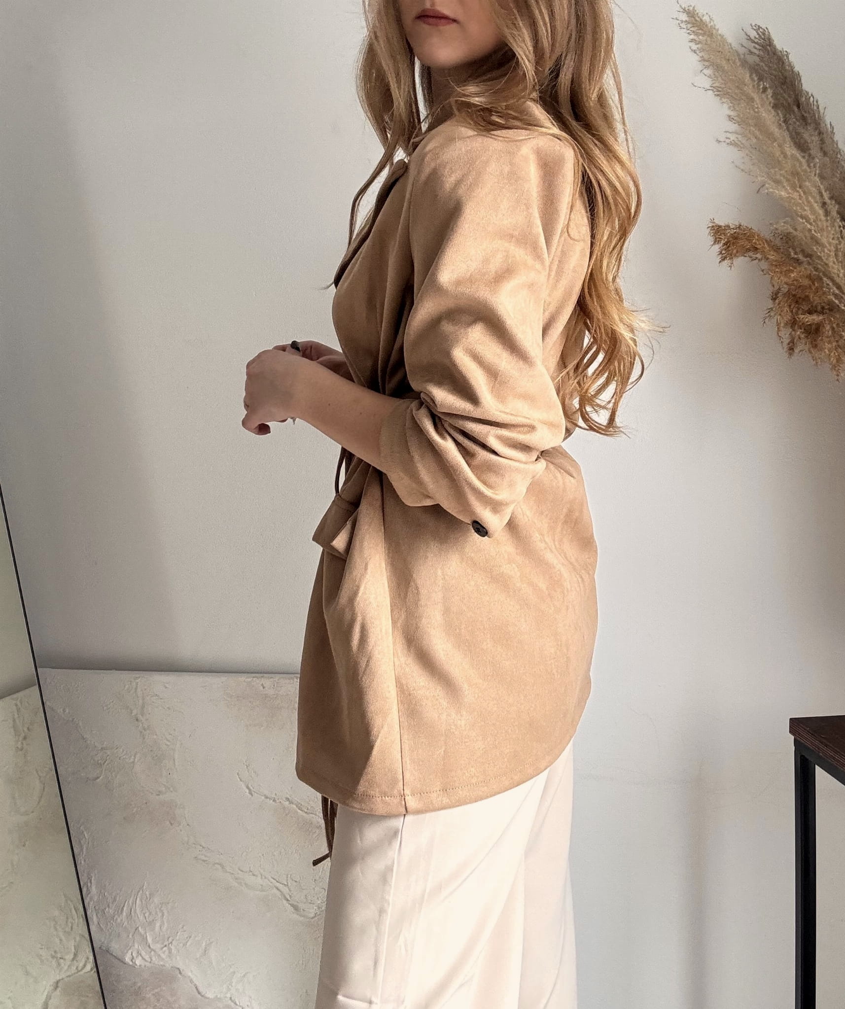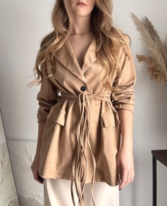 Brązowa, dłuższa zamszowa marynarka wiązana New Collection, możliwość wiązania z przodu lub z tyłu, gumka z tyłu w pasie, poduszki na ramionach. Dla niższych osób może posłużyć jako sukienka. Materiał rozciągliwy.