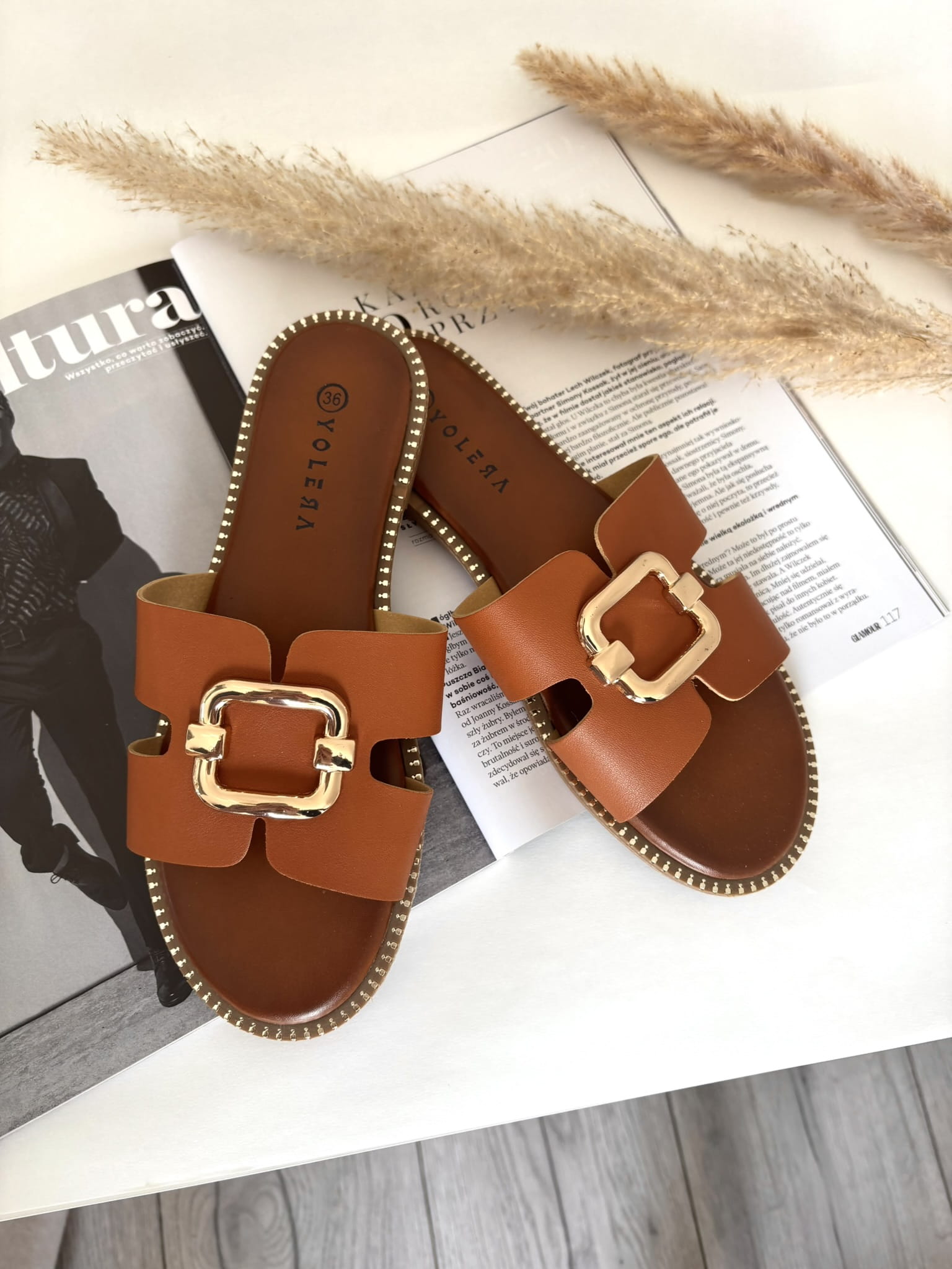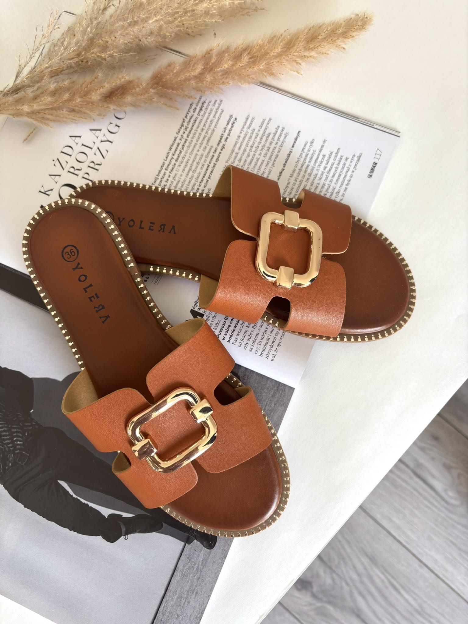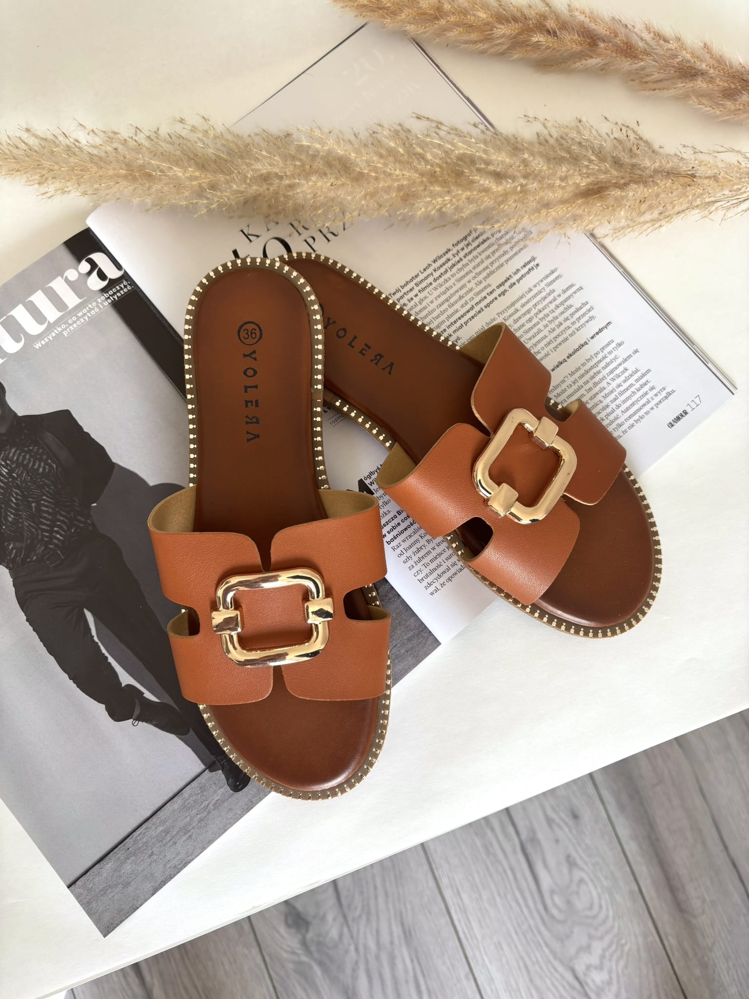 Karmelowo-brązowe letnie klapki ze złotą klamrą.