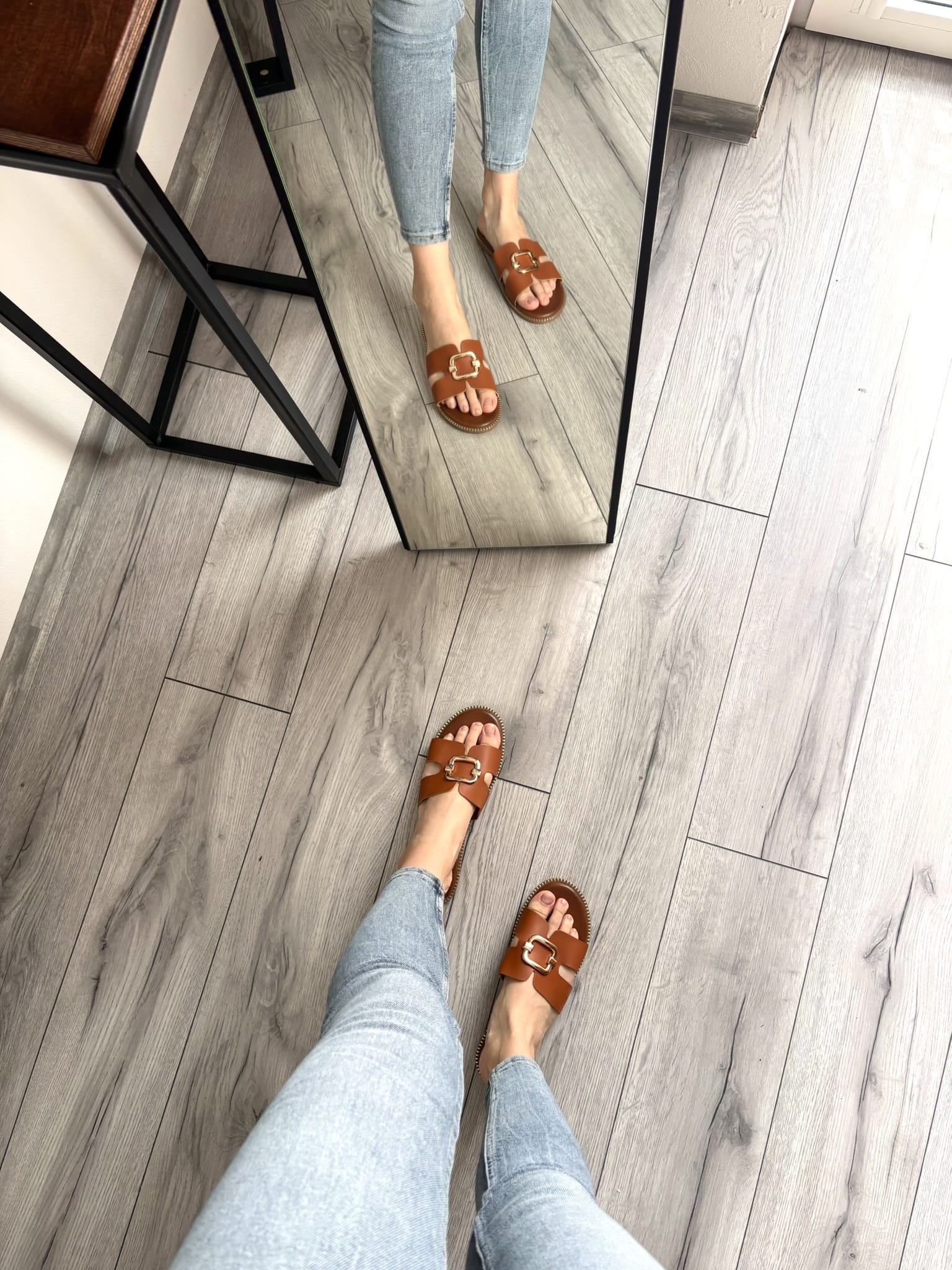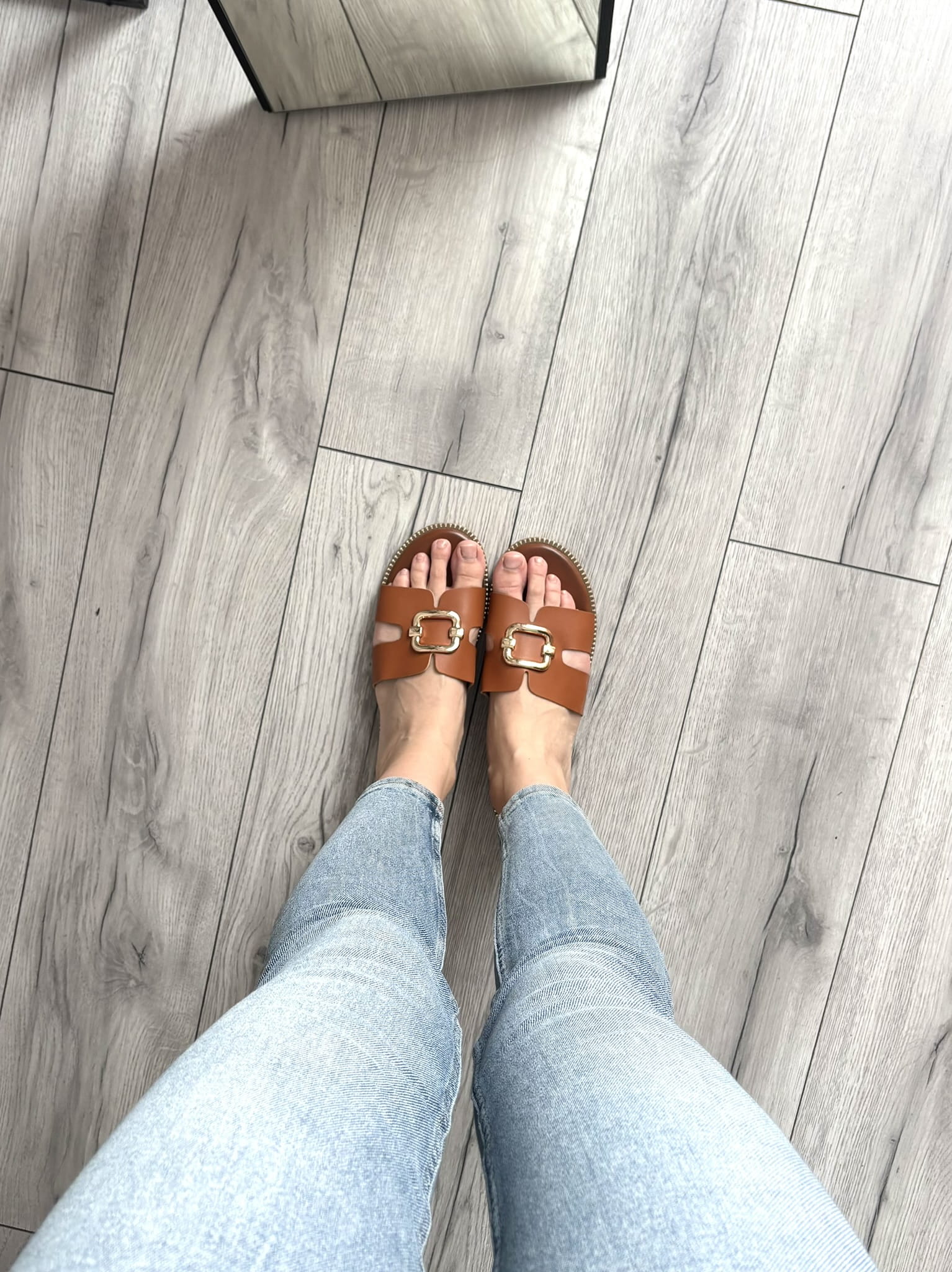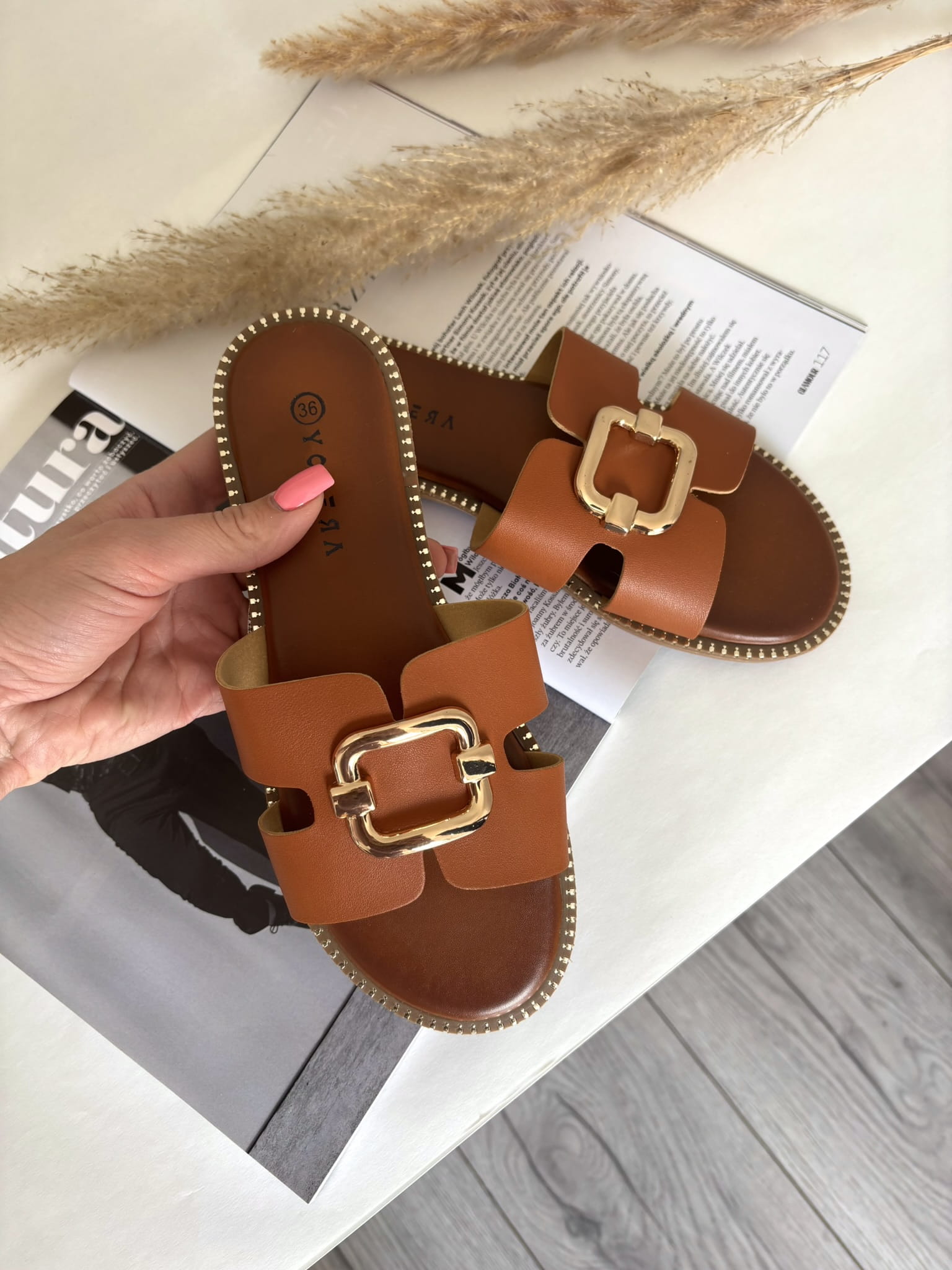 Karmelowo-brązowe letnie klapki ze złotą klamrą.
