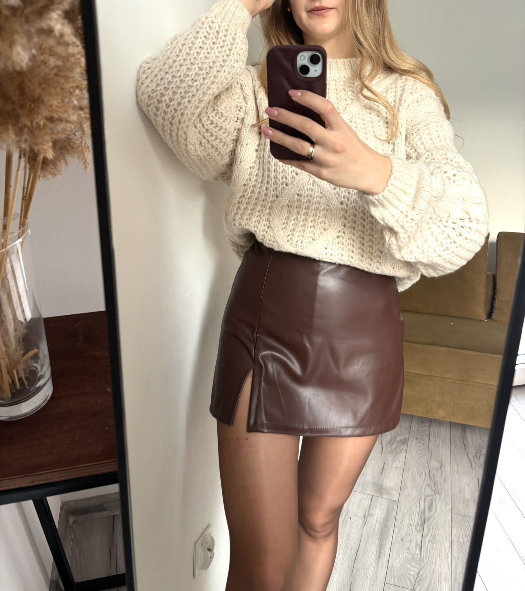 Brązowe skórzane spódnico-spodenki z wysokim stanem i rozporkiem, Styled in Italy. Rozciągliwe- dopasowują się do sylwetki.