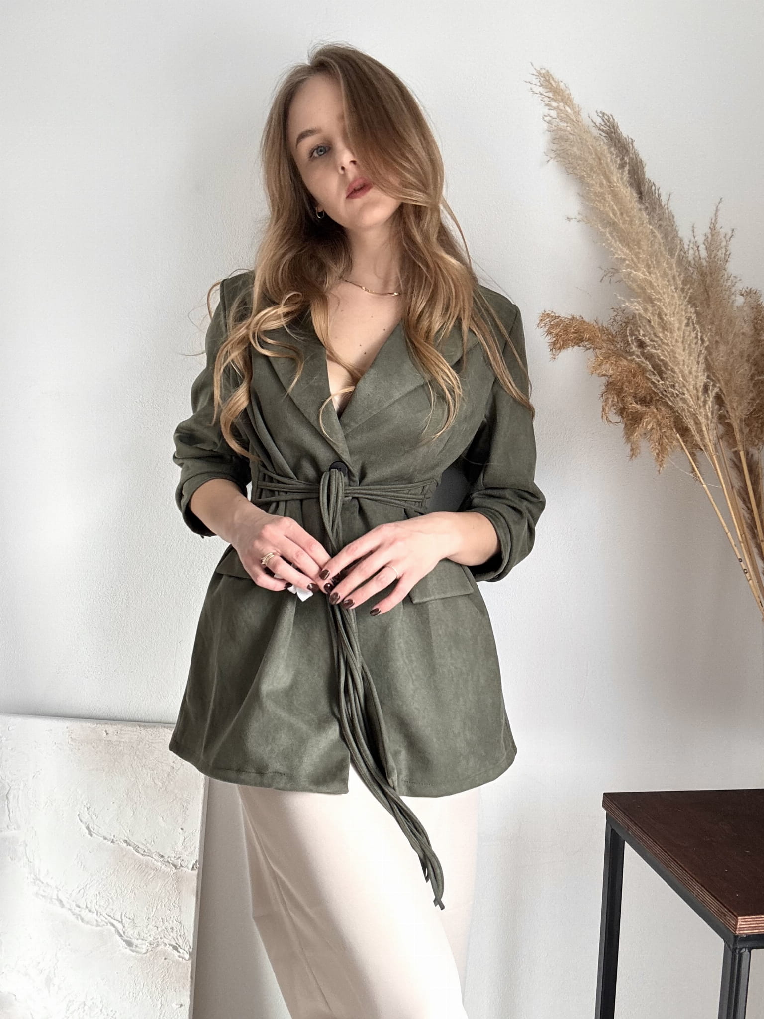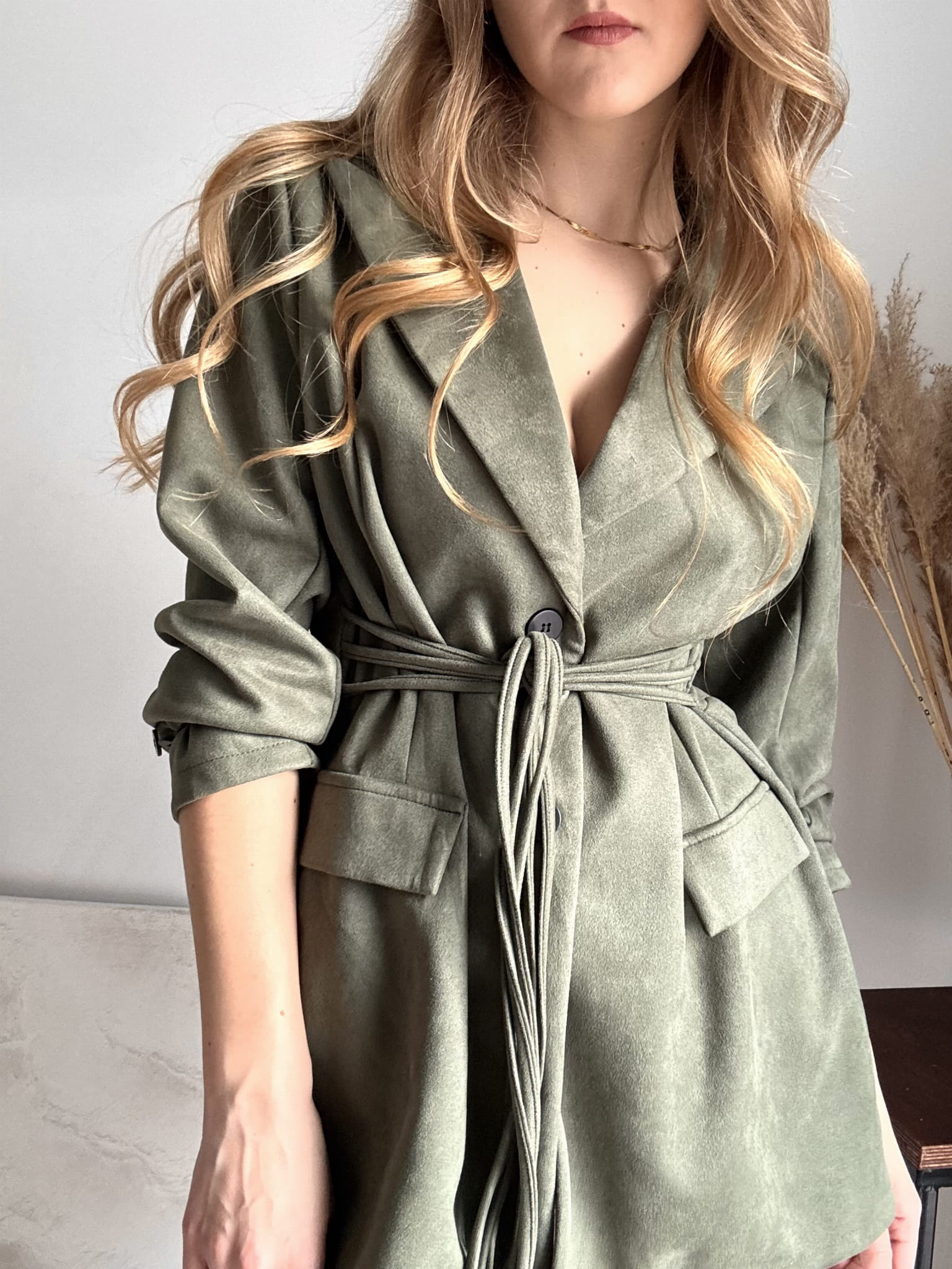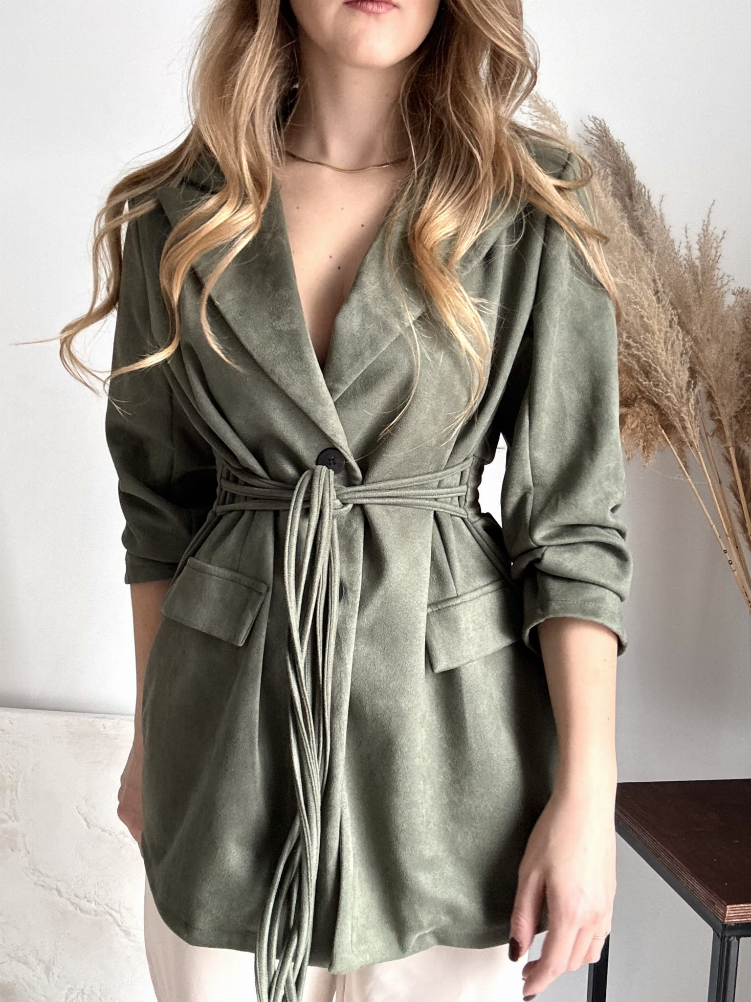 Ciemnozielona khaki dłuższa marynarka wiązana New Collection, zamszowa