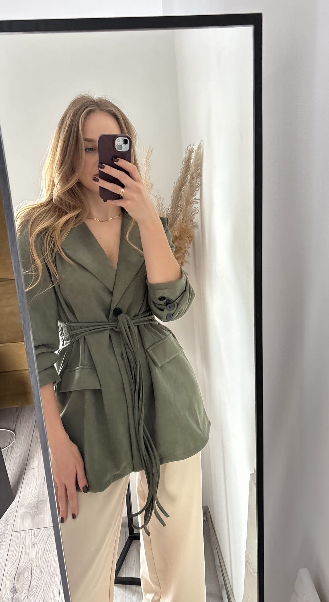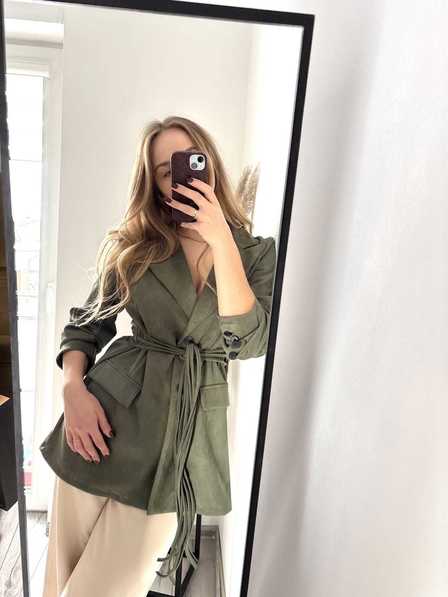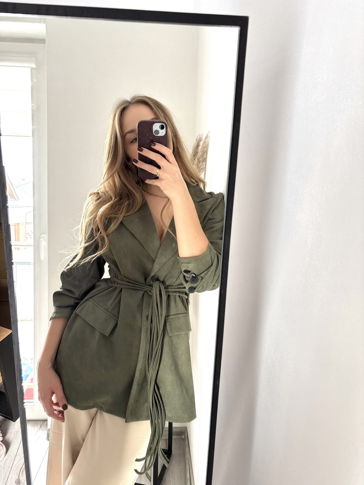 Ciemnozielona khaki dłuższa marynarka wiązana New Collection, zamszowa