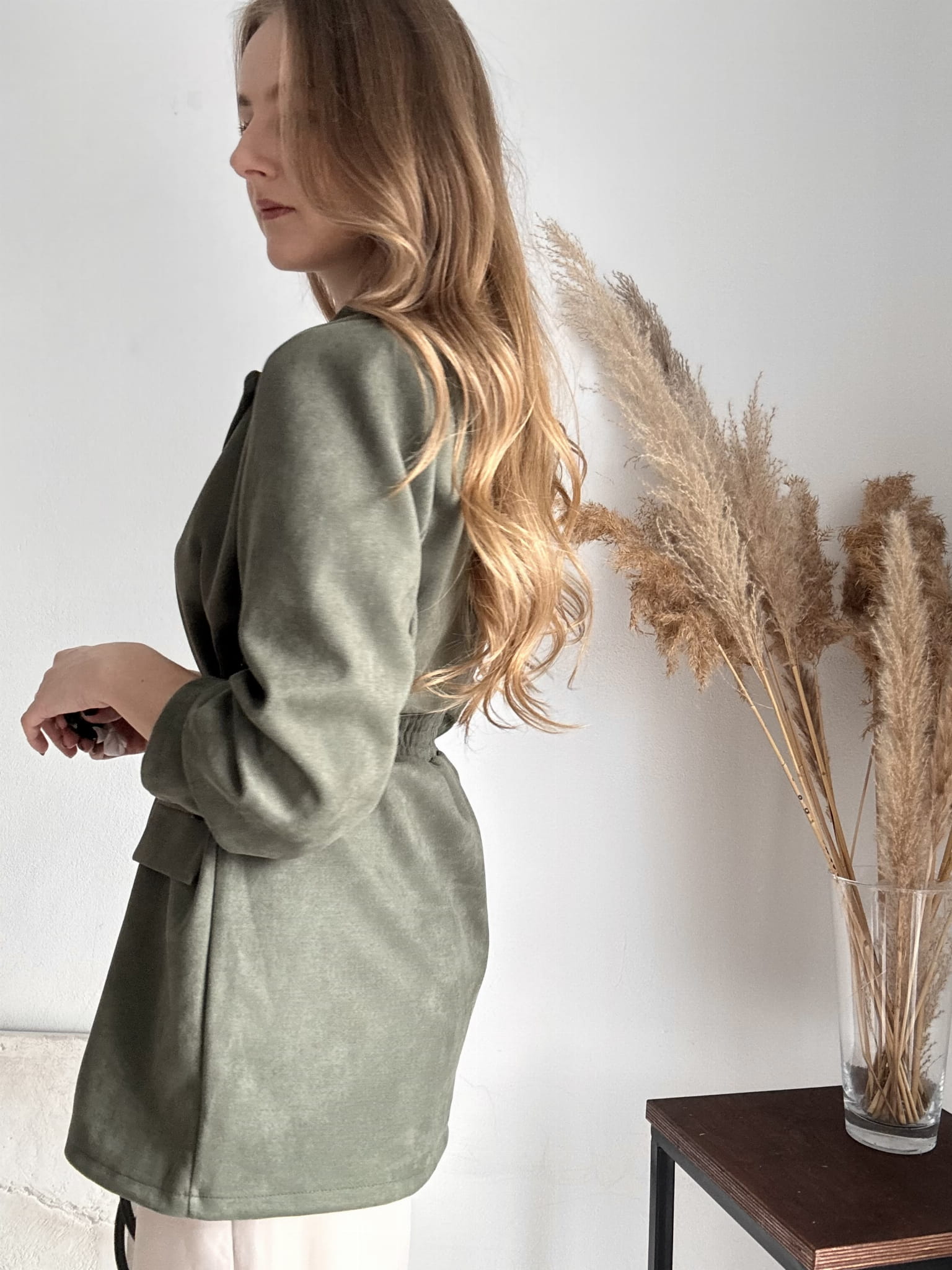 Ciemnozielona, khaki dłuższa zamszowa marynarka wiązana New Collection, możliwość wiązania z przodu lub z tyłu, gumka z tyłu w pasie, poduszki na ramionach. Dla niższych osób może posłużyć jako sukienka. Materiał rozciągliwy.