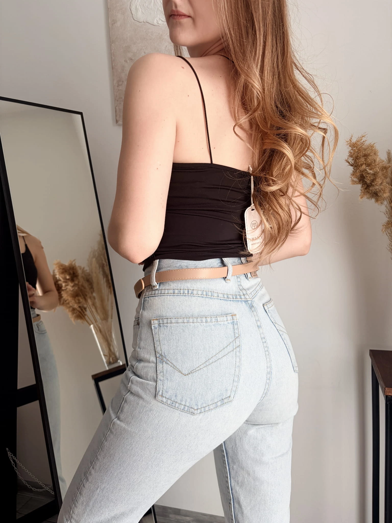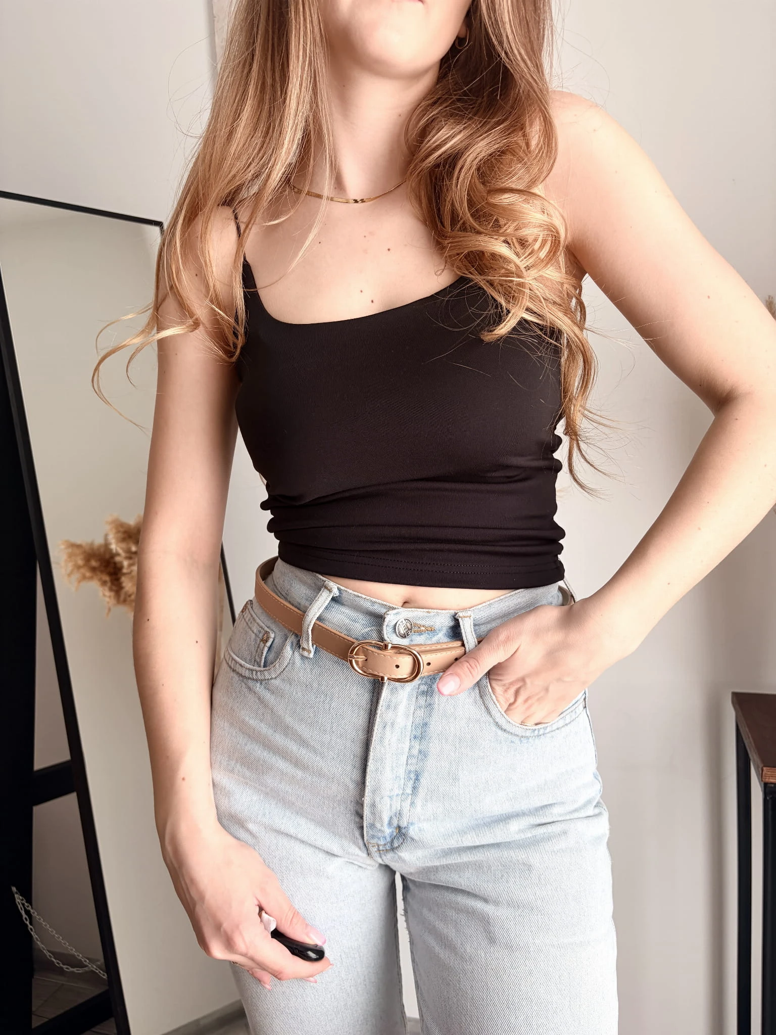 Czarny, klasyczny top na ramiączkach Mojo, rozmiar uniwersalny, będzie pasować na S-M-L. Treściwy, rozciągliwy materiał, podwójny z przodu. Ramiączka spaghetti.