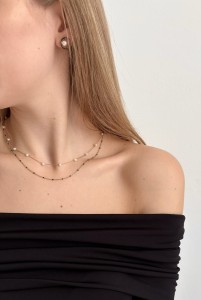 Delikatny naszyjnik zdobiony koralikami w złotym kolorze wykonany ze stali chirurgicznej.