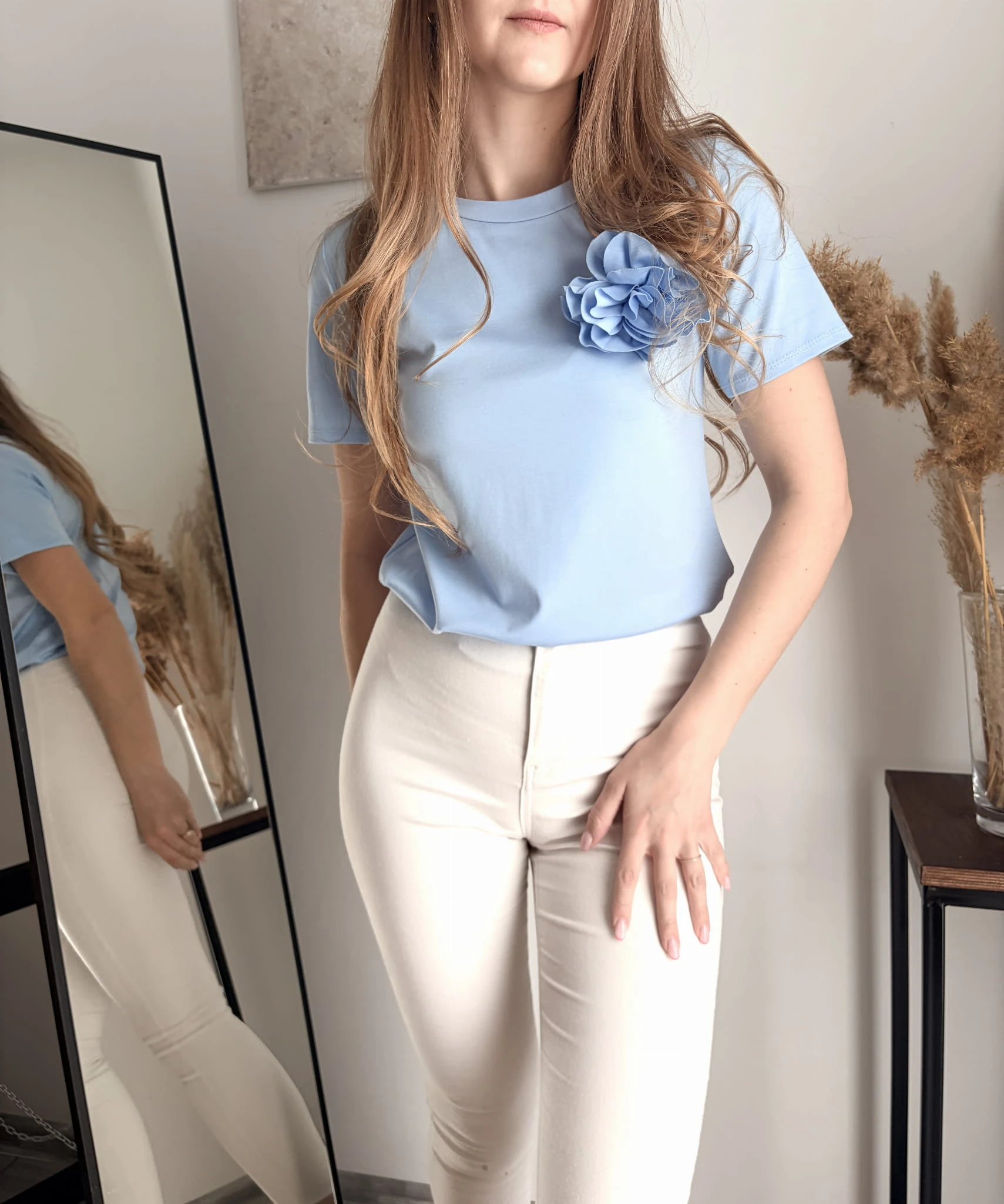 Jasnoniebieska koszulka z krótkim rękawem i różyczką wiosenna Sweetissima rozmiar uniwersalny, materiał rozciągliwy.