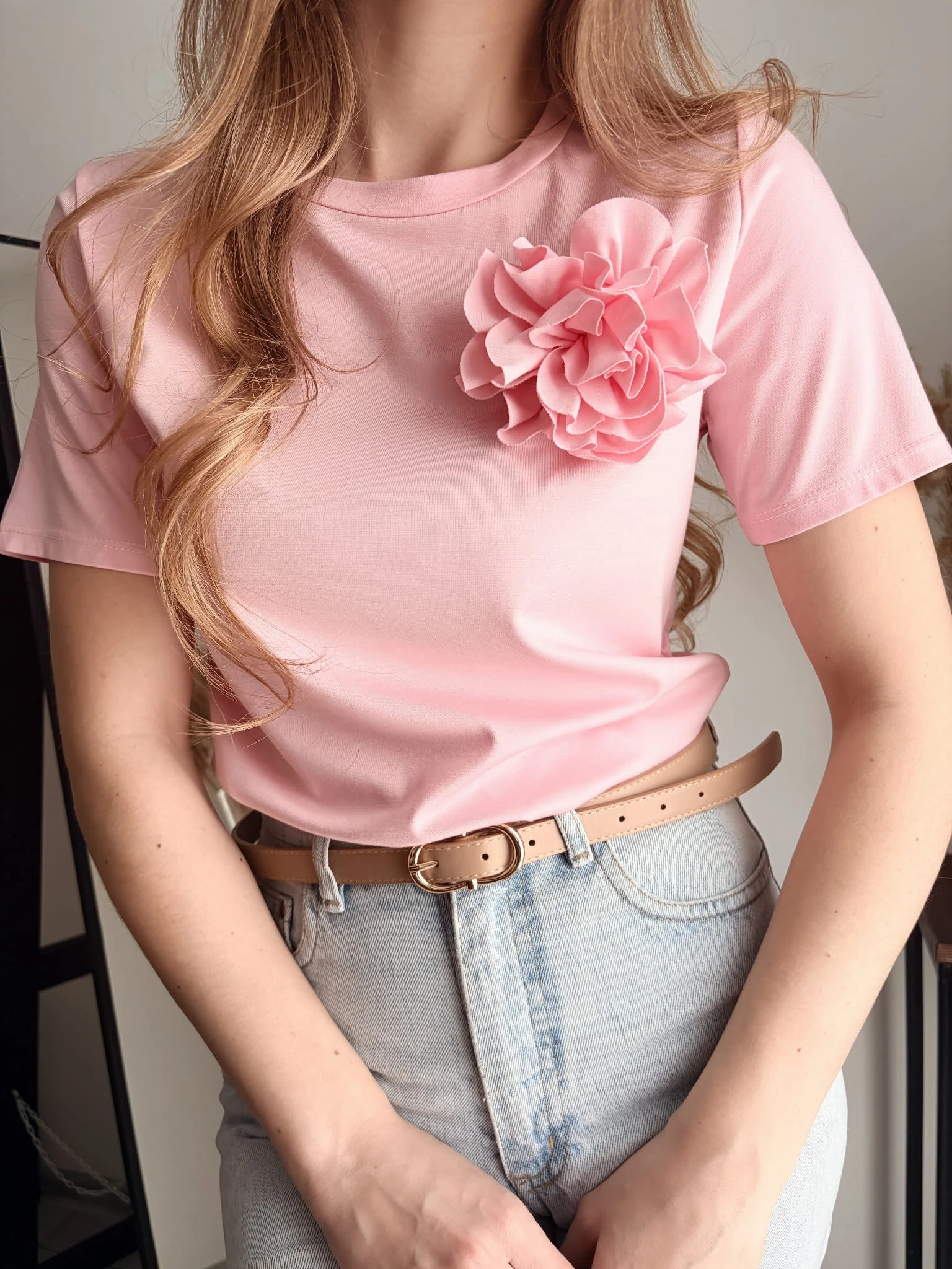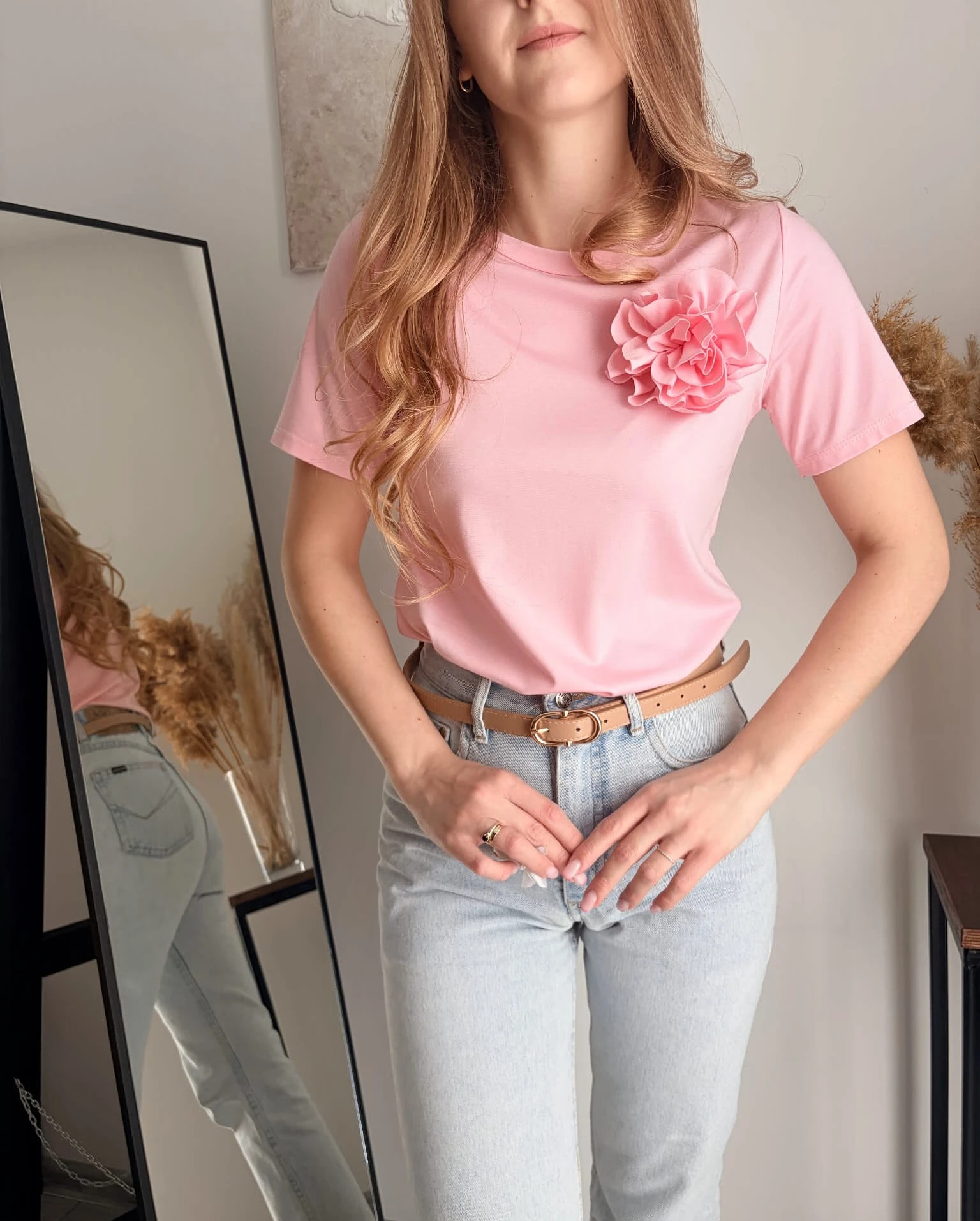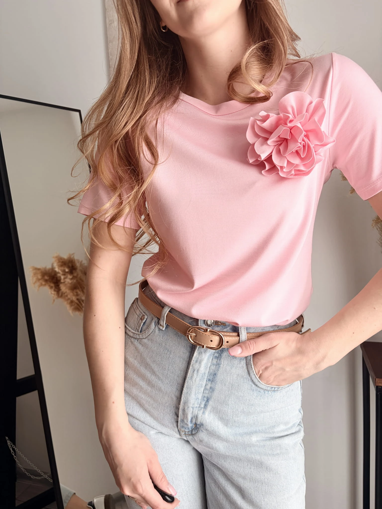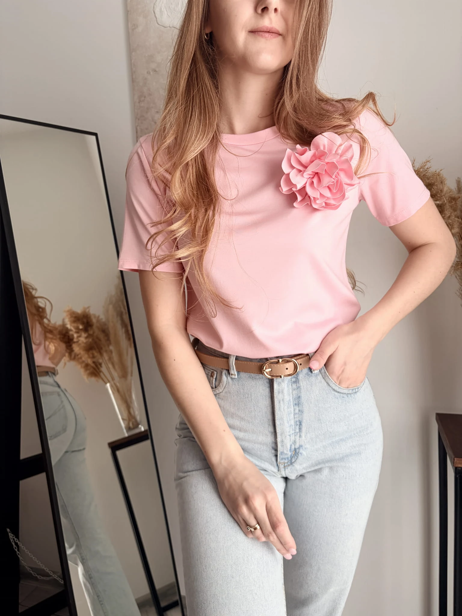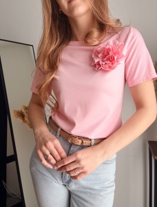 Jasnoróżowa koszulka z krótkim rękawem i różyczką wiosenna Sweetissima rozmiar uniwersalny, materiał rozciągliwy.