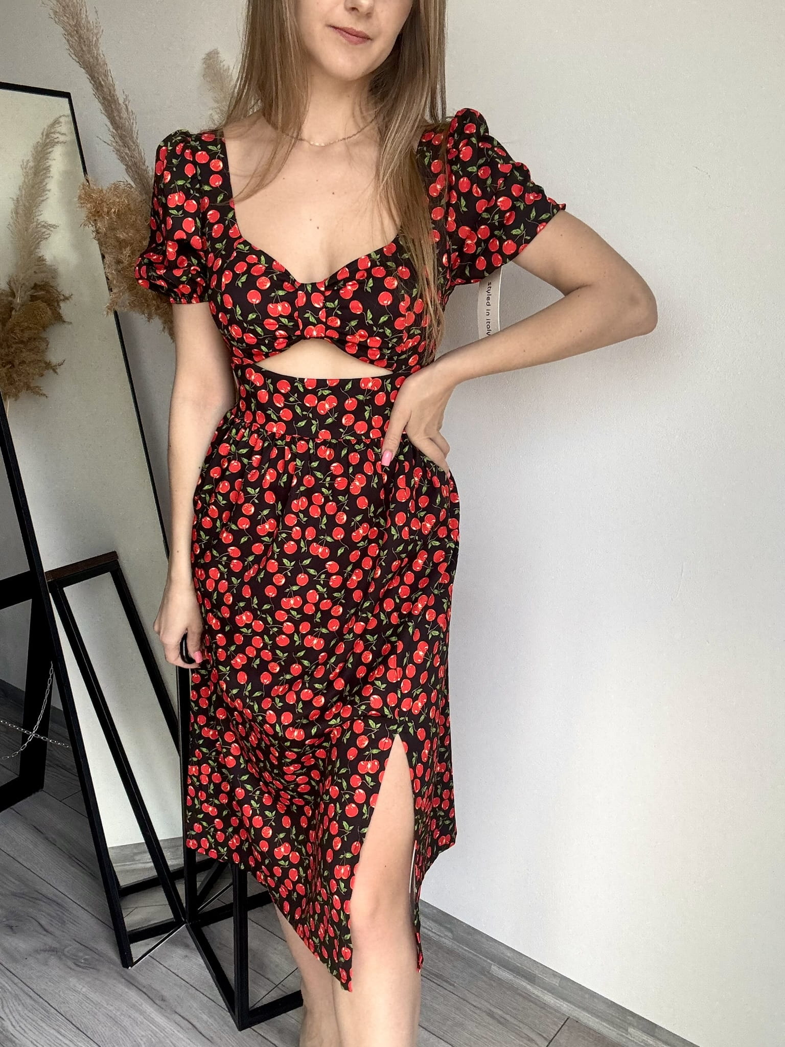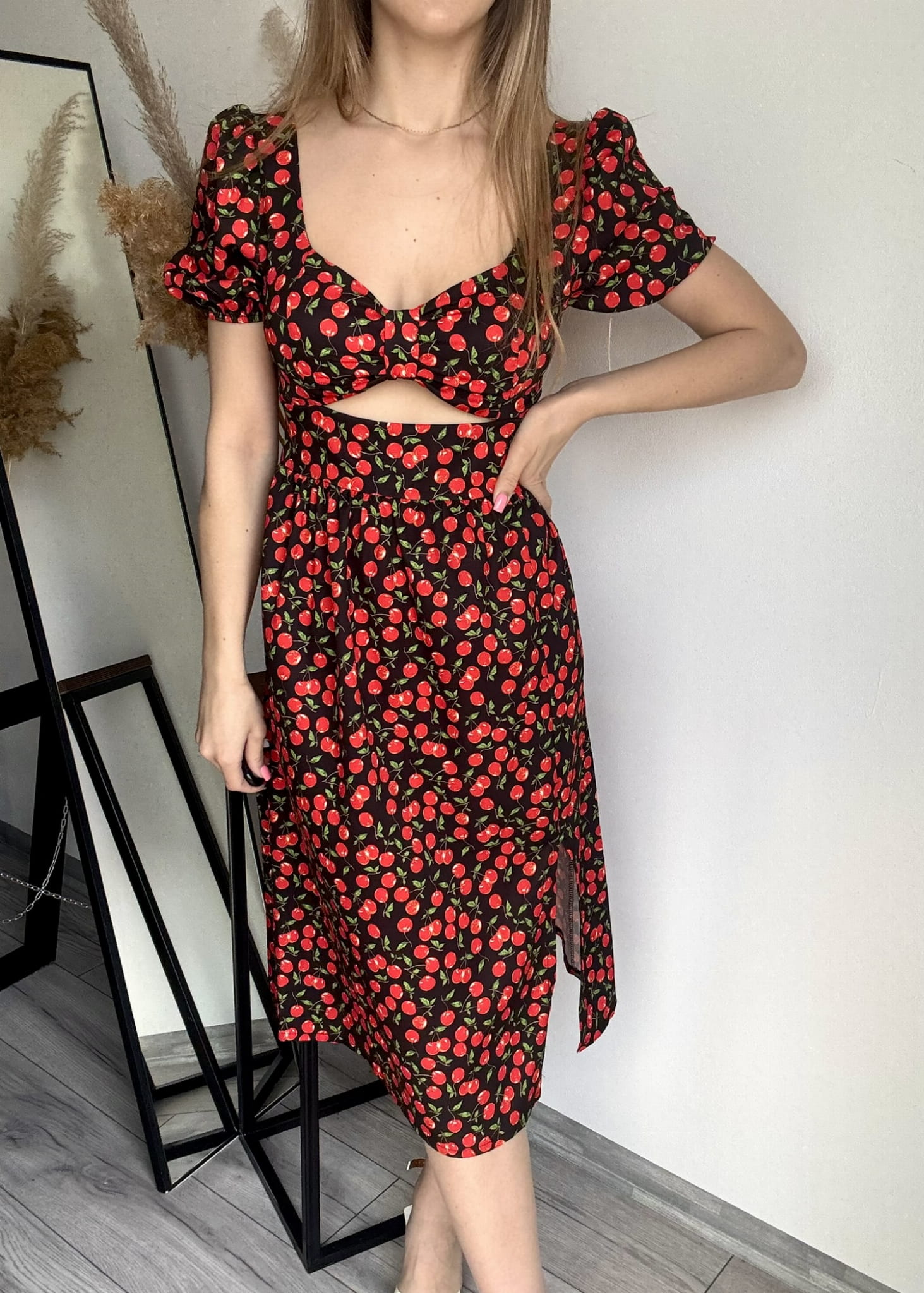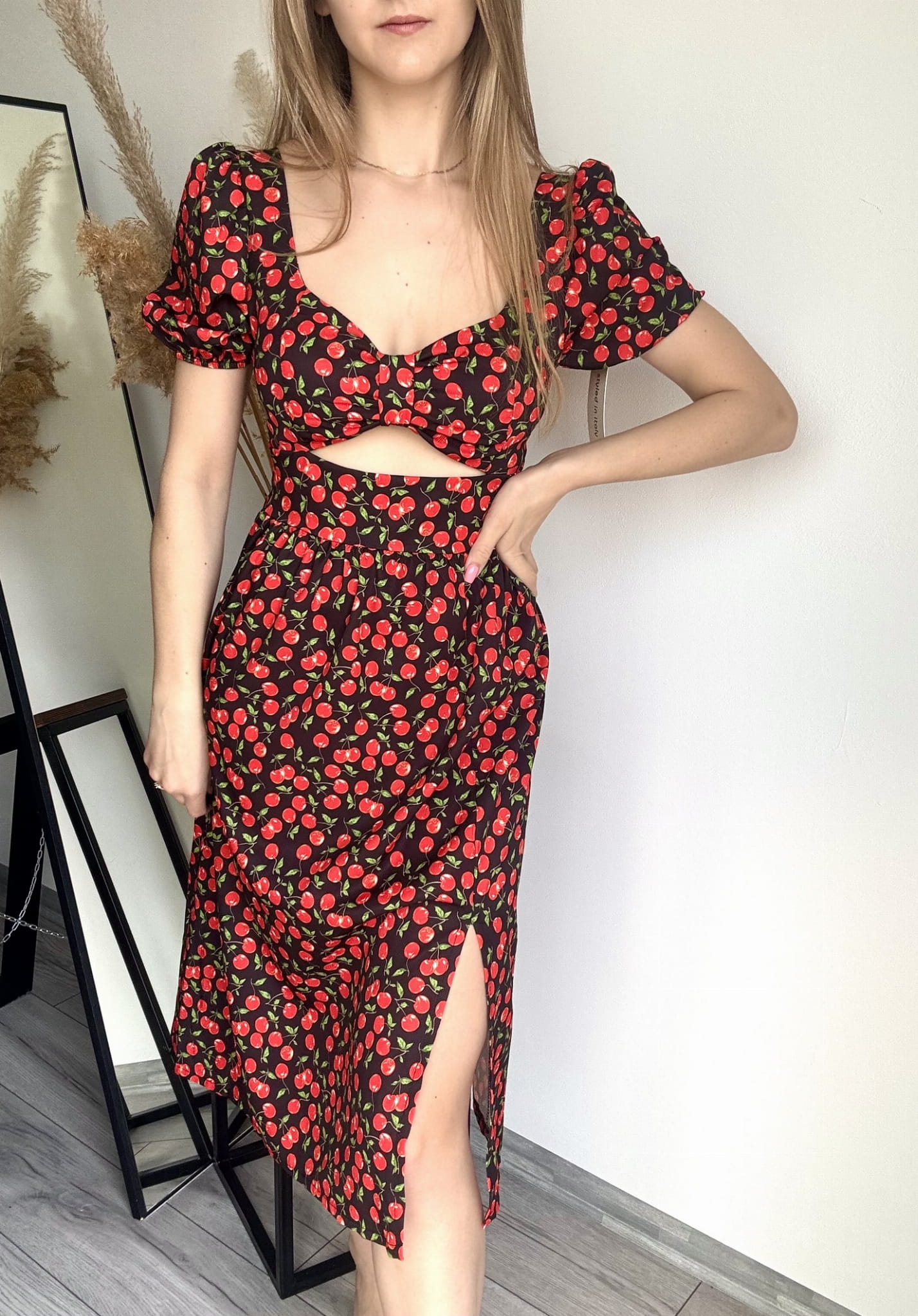 Kolorowa sukienka w wisienki midi z rozcięciem
