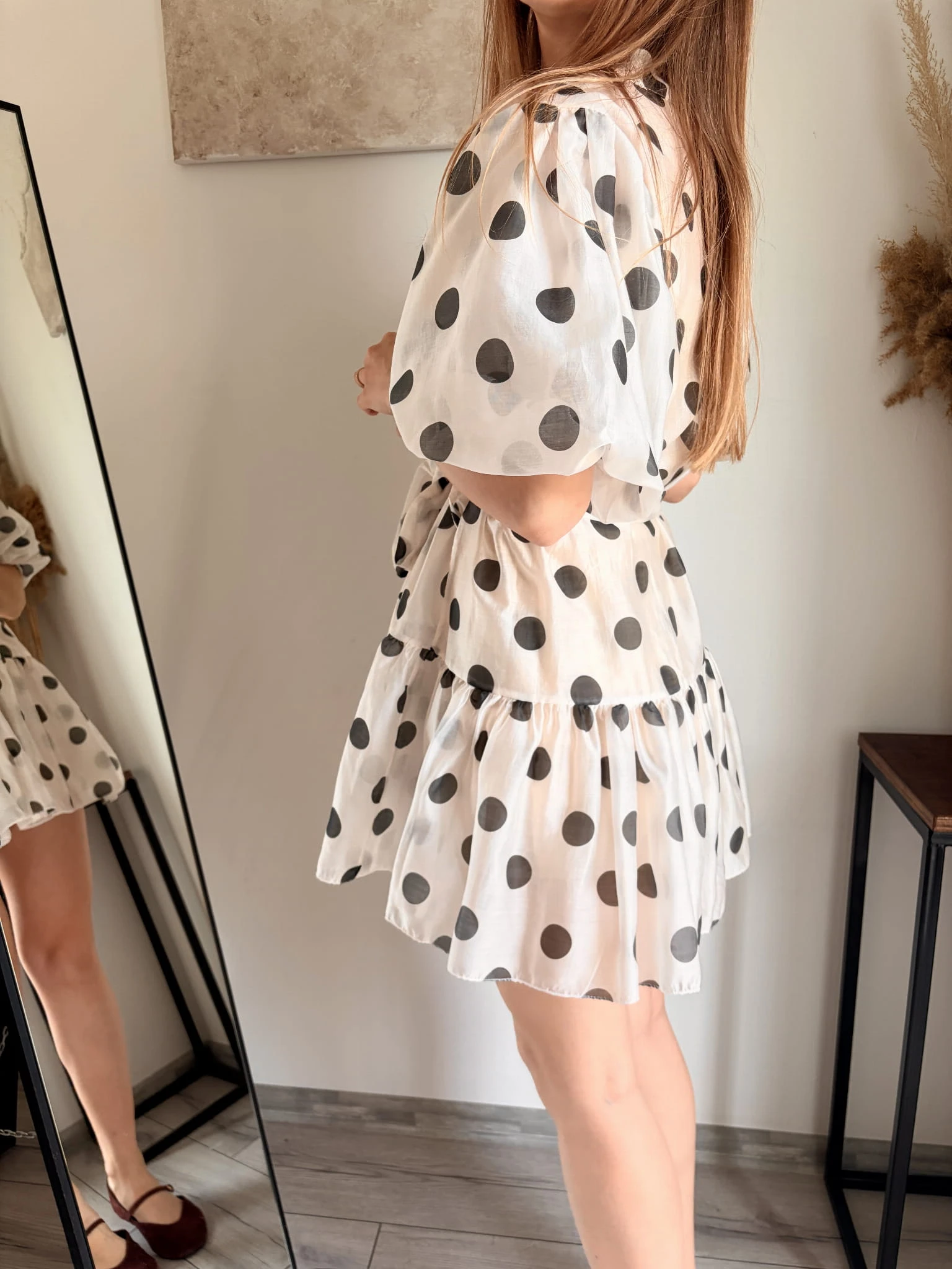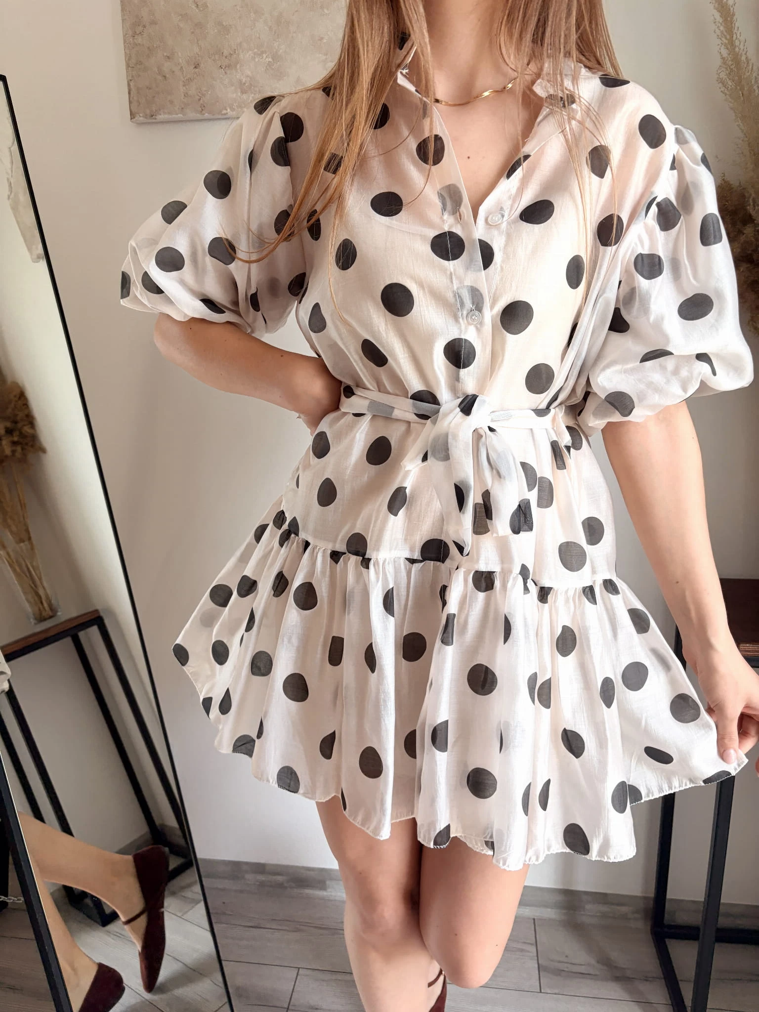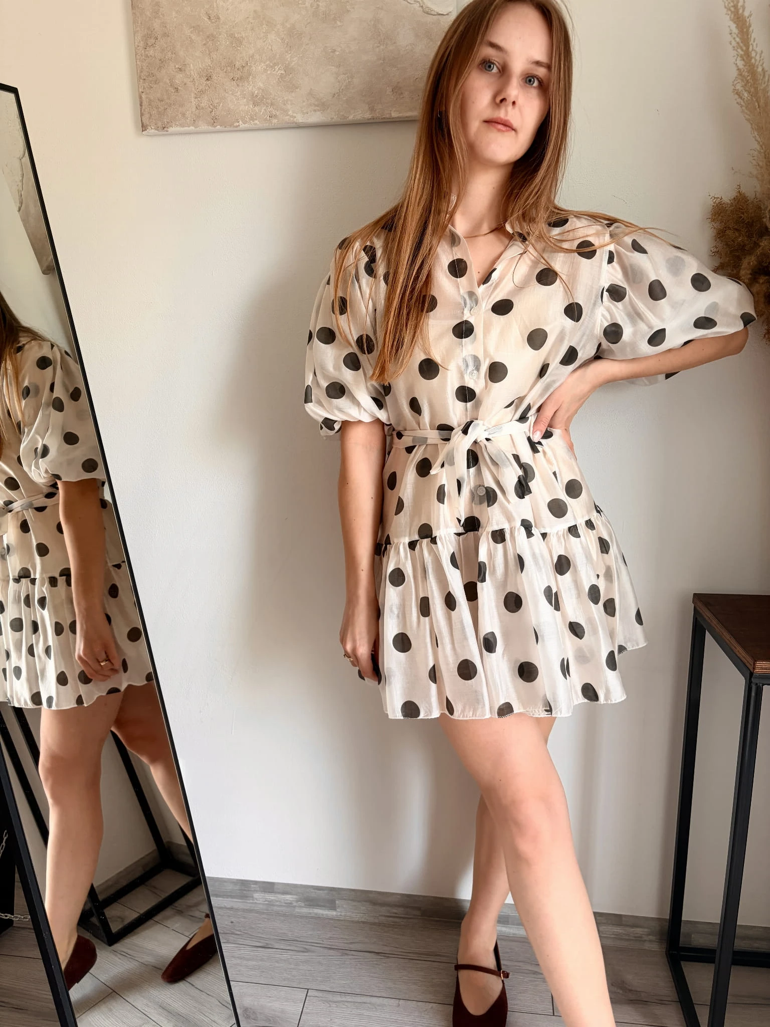 Kremowa sukienka w czarne grochy, groszki mini na komunię chrzciny La Look. Sukienka ma bufki na rękawach, jest wiązana w pasie. Ma podszewkę.