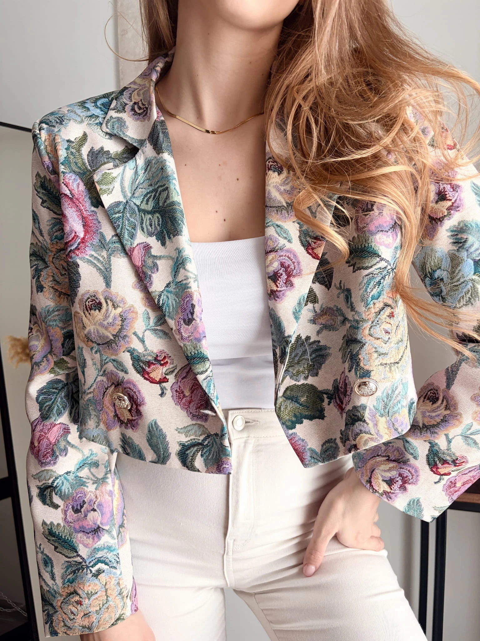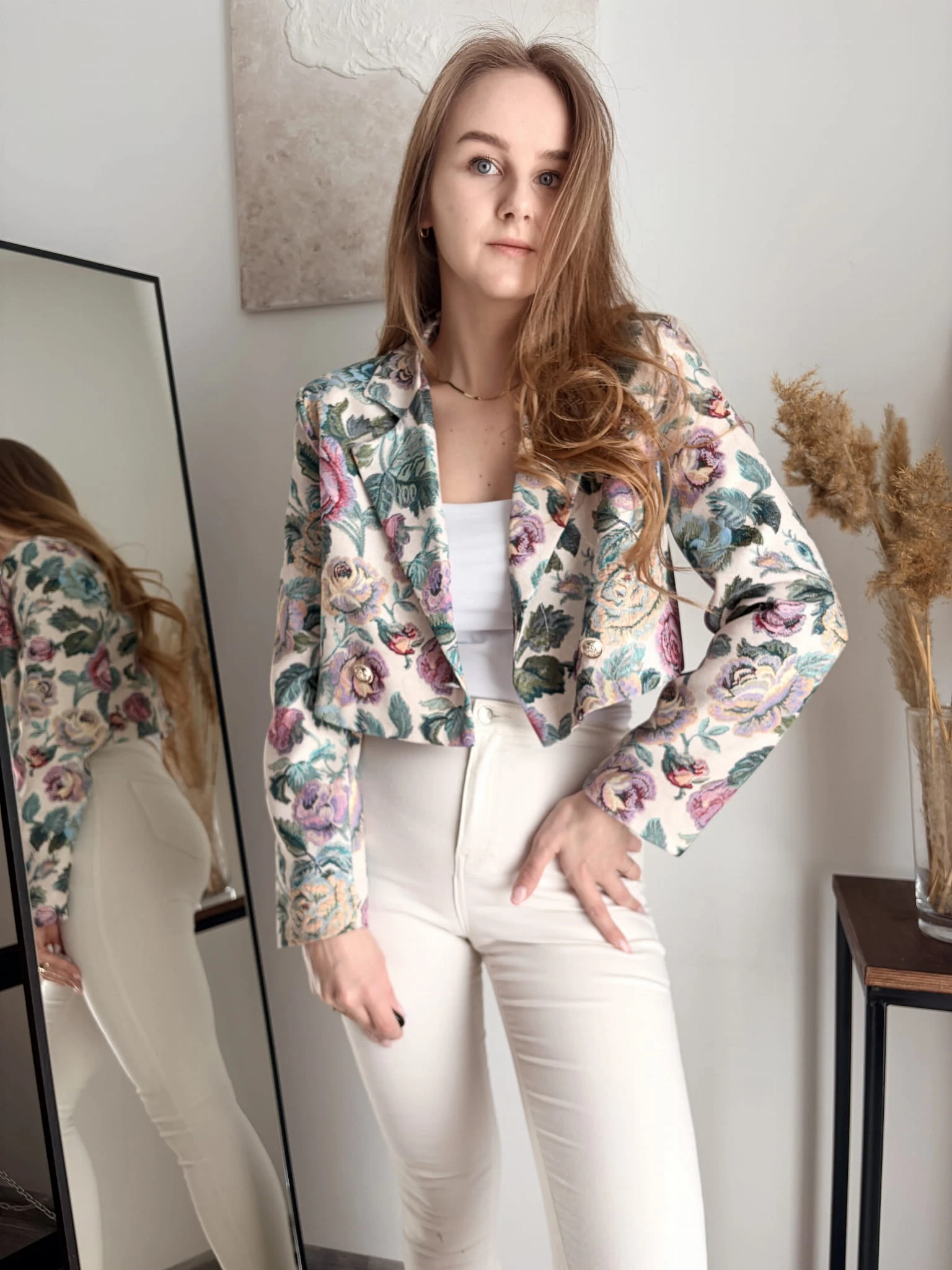 Krótka marynarka w kwiaty z ozdobnymi guzikami, New Collection, rozmiar uniwersalny.