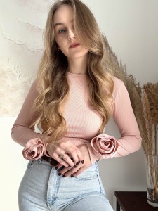 Pastelowo różowa bluzka dopasowana z różyczkami na rękawach, wiosenna HZ Moda rozmiar uniwersalny