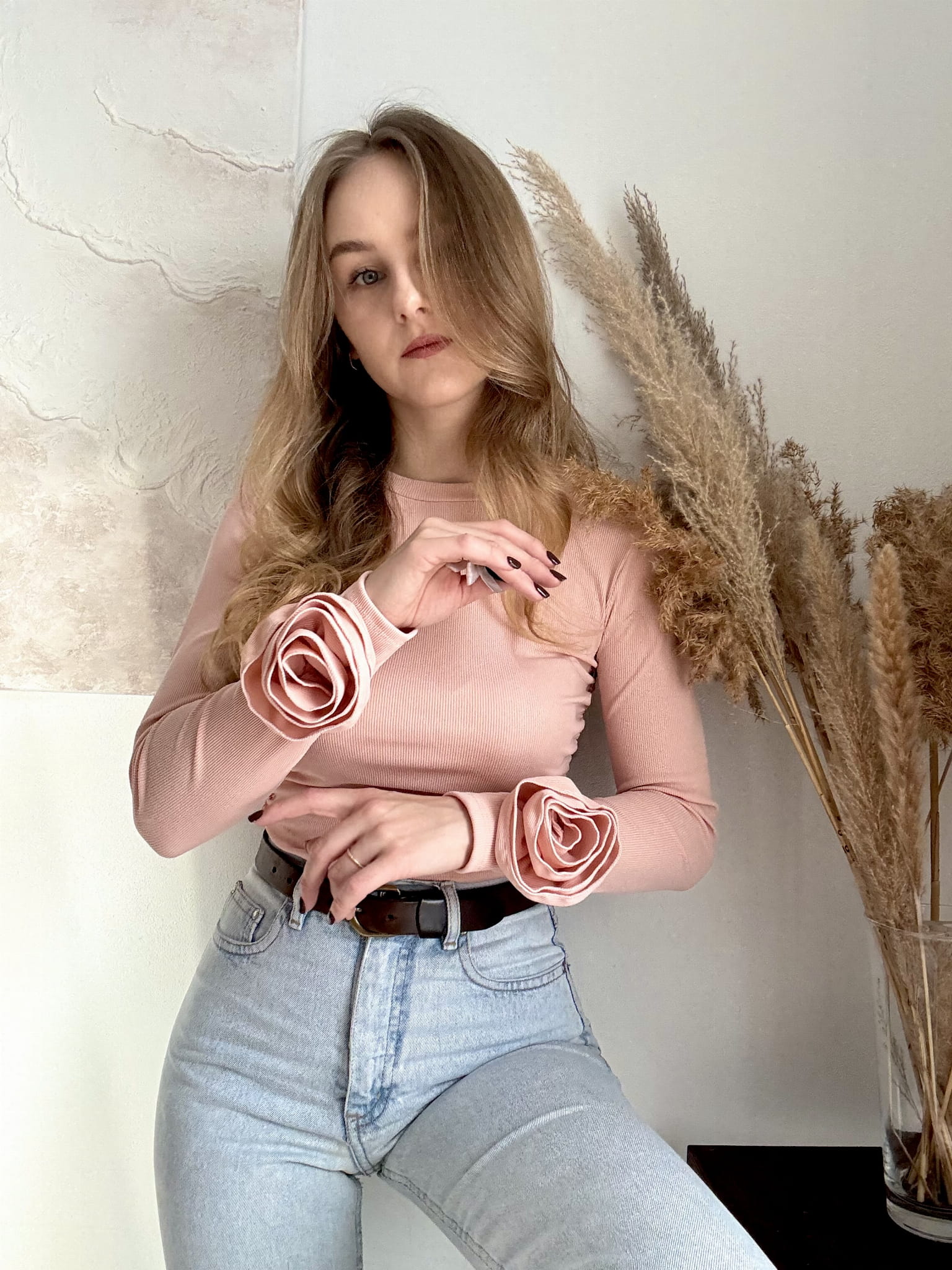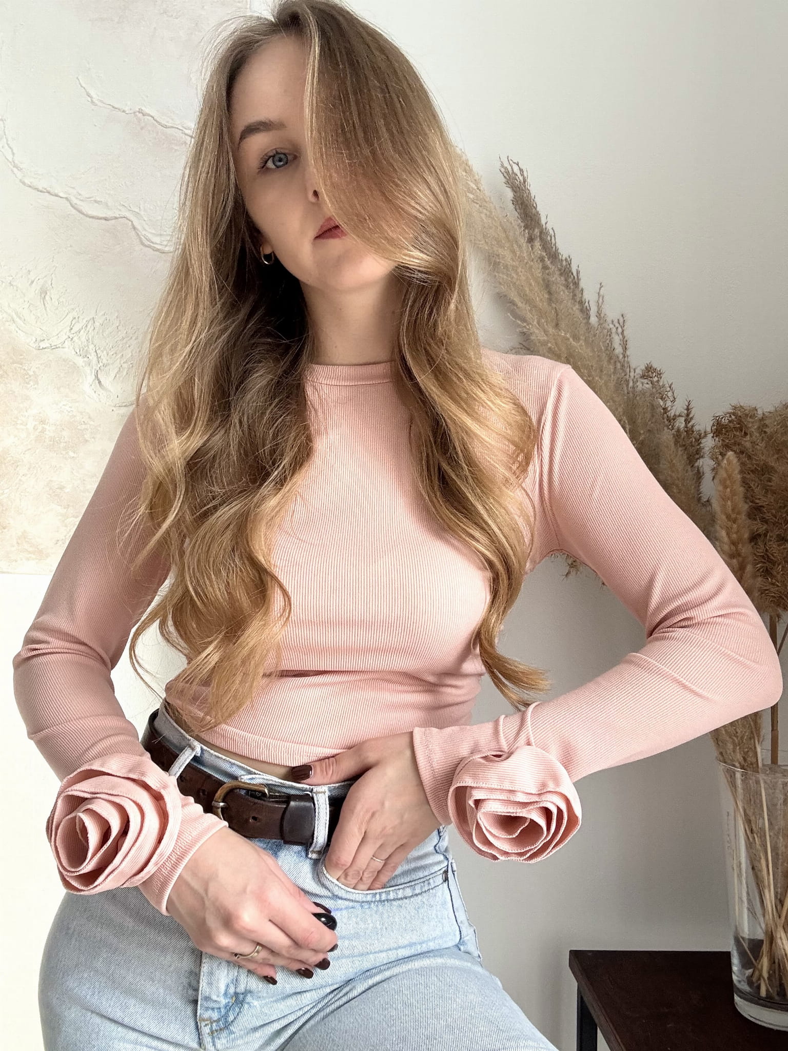 Pastelowo różowa bluzka dopasowana z różyczkami na rękawach, wiosenna, materiał prążkowany, rozciągliwy, rozmiar uniwersalny