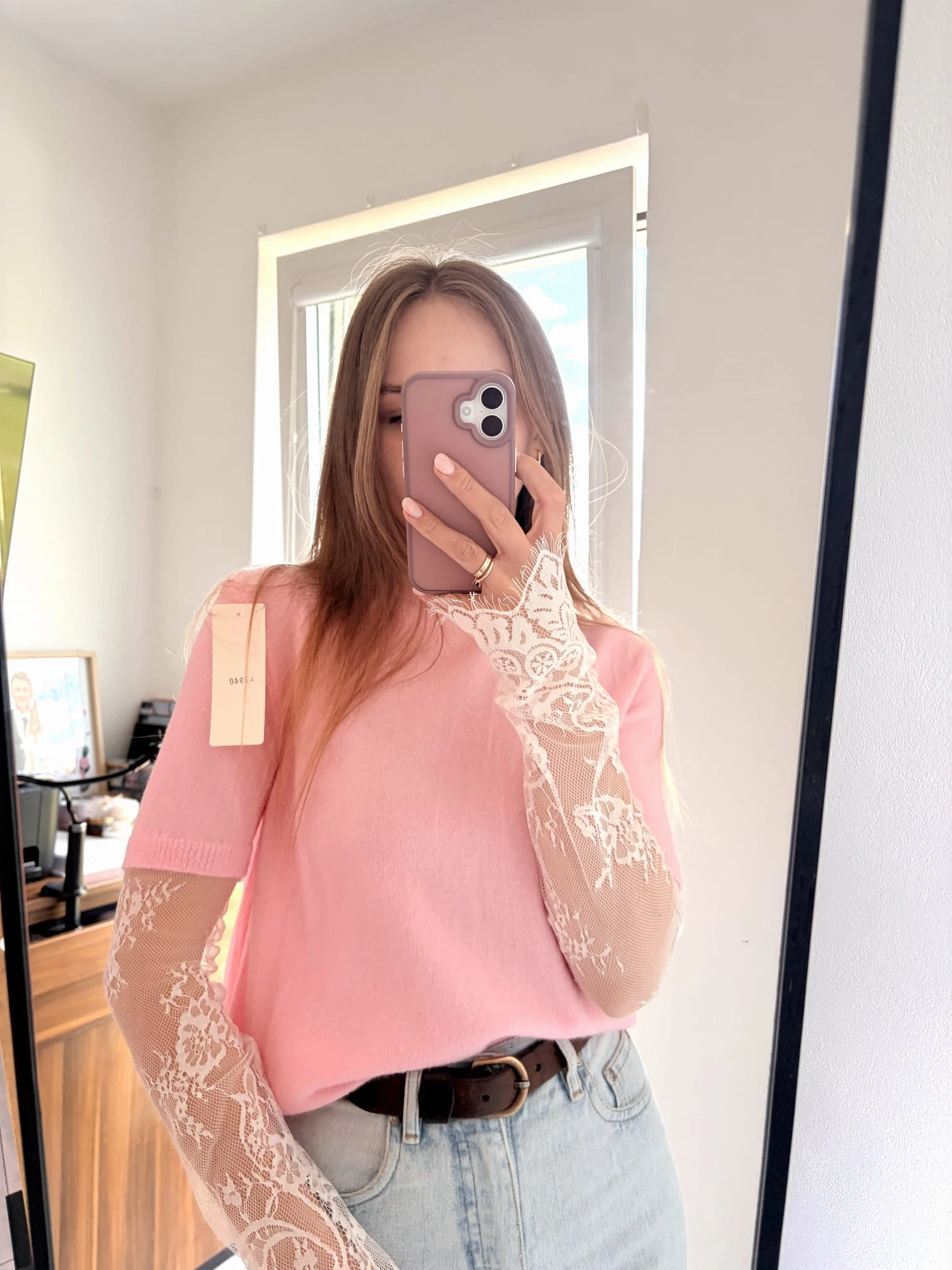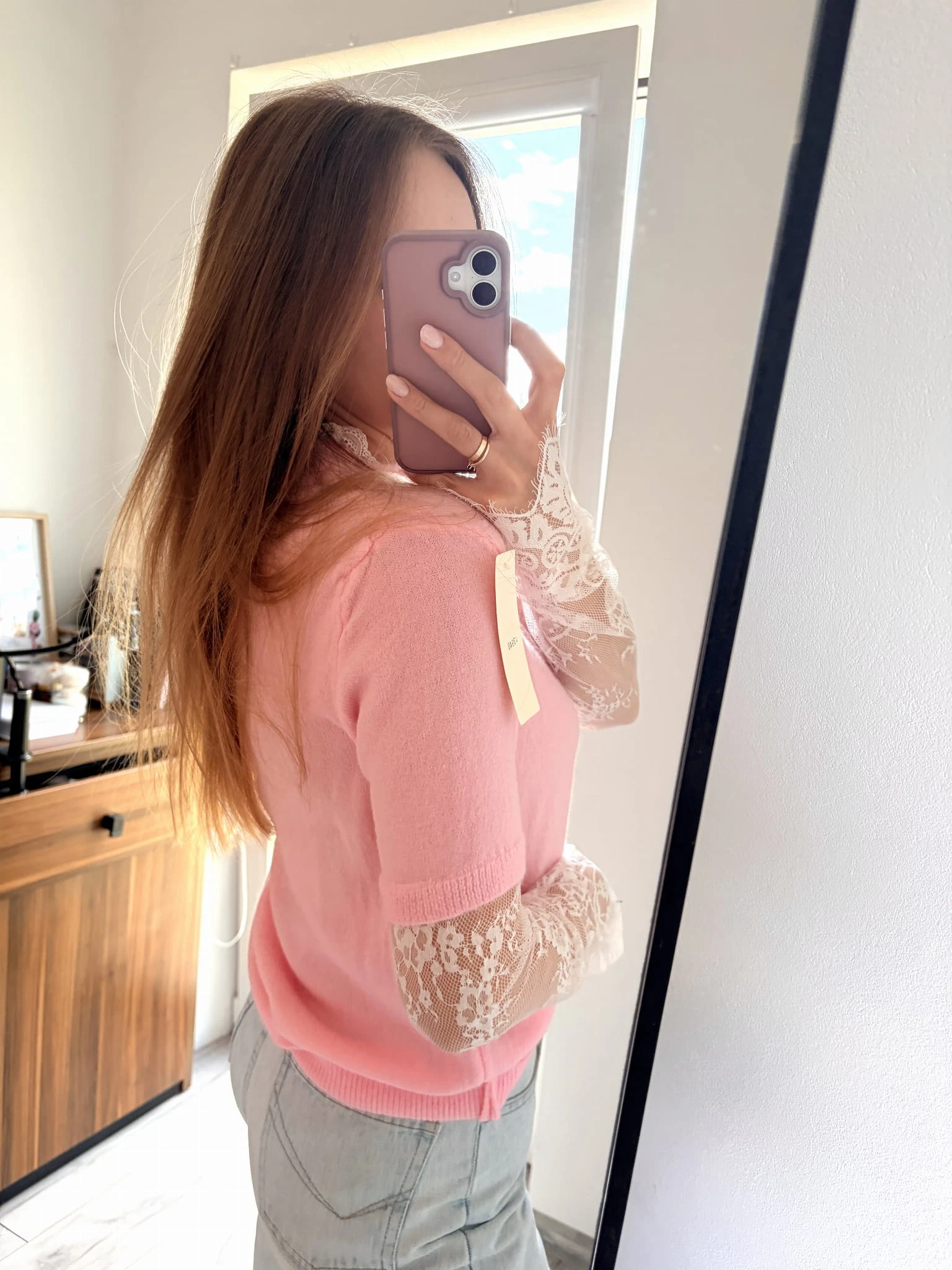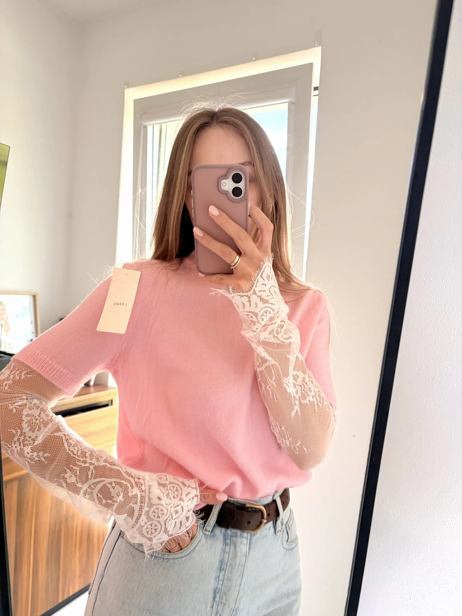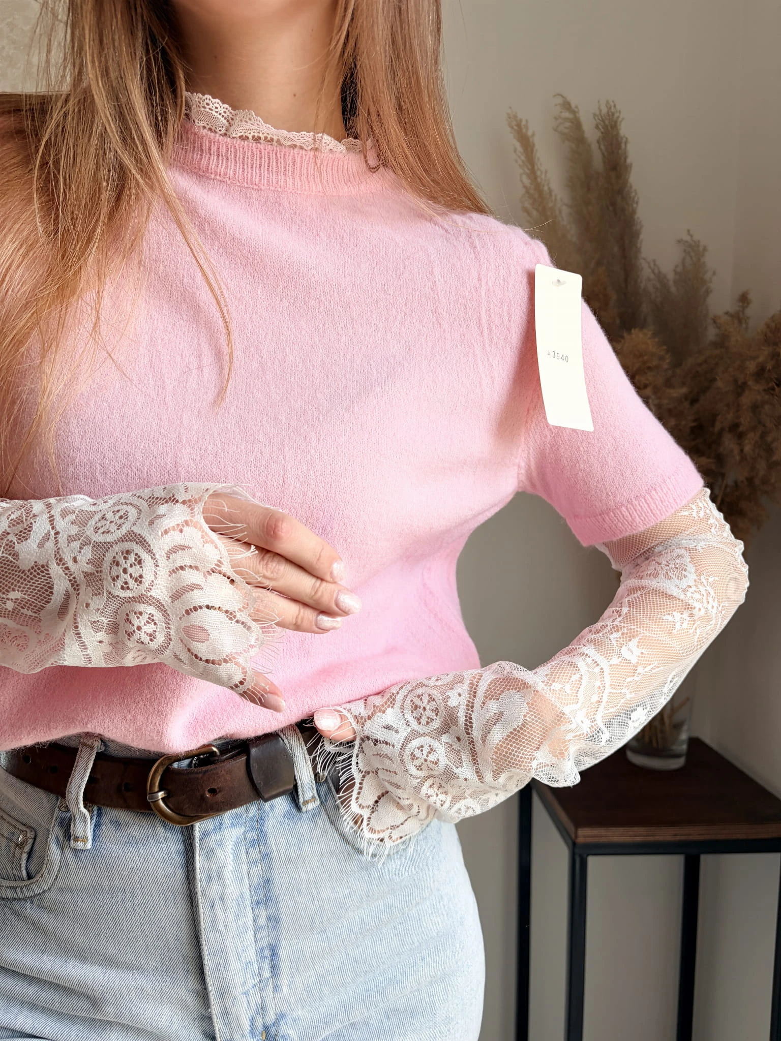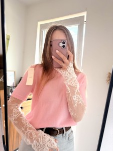 Pastelowo różowy, wiosenny sweter z koronkowymi rękawami Made In Italy, rozmiar uniwersalny