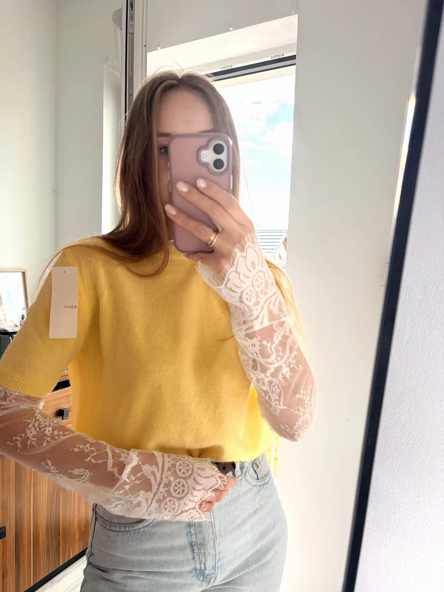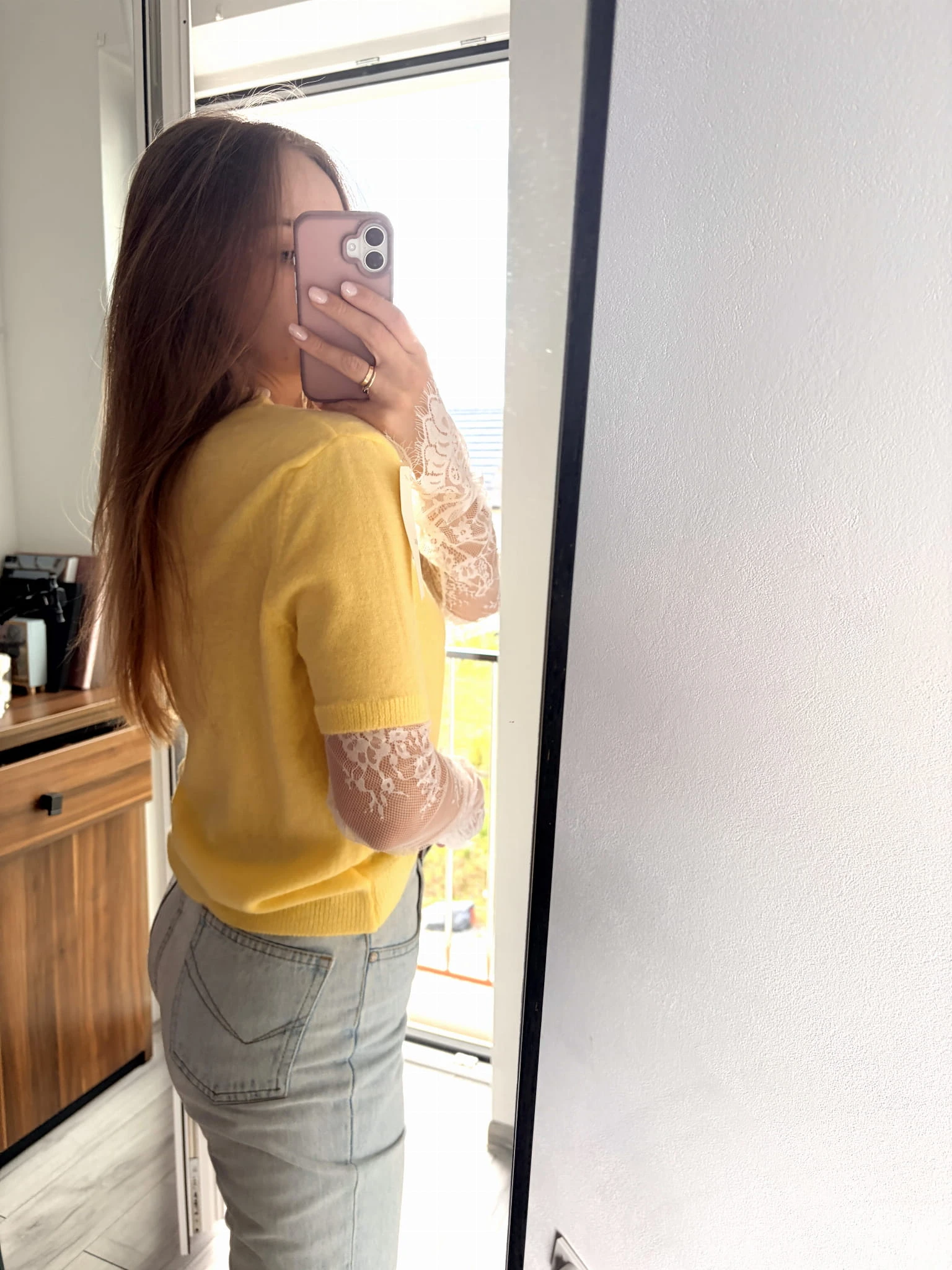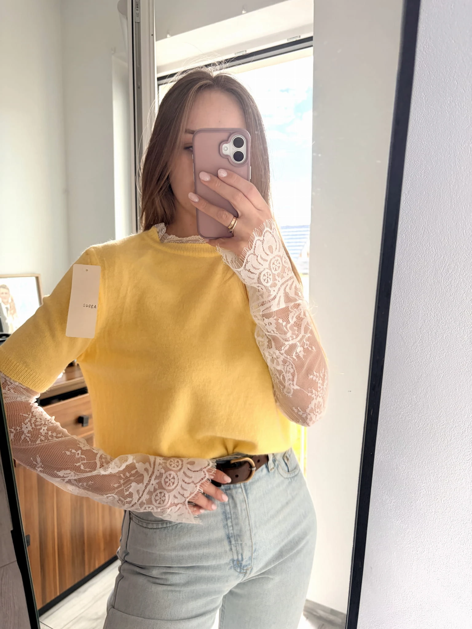 Pastelowo żółty, wiosenny sweter z koronkowymi rękawami Made In Italy, rozmiar uniwersalny