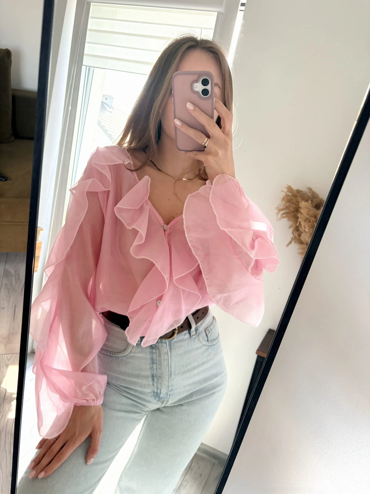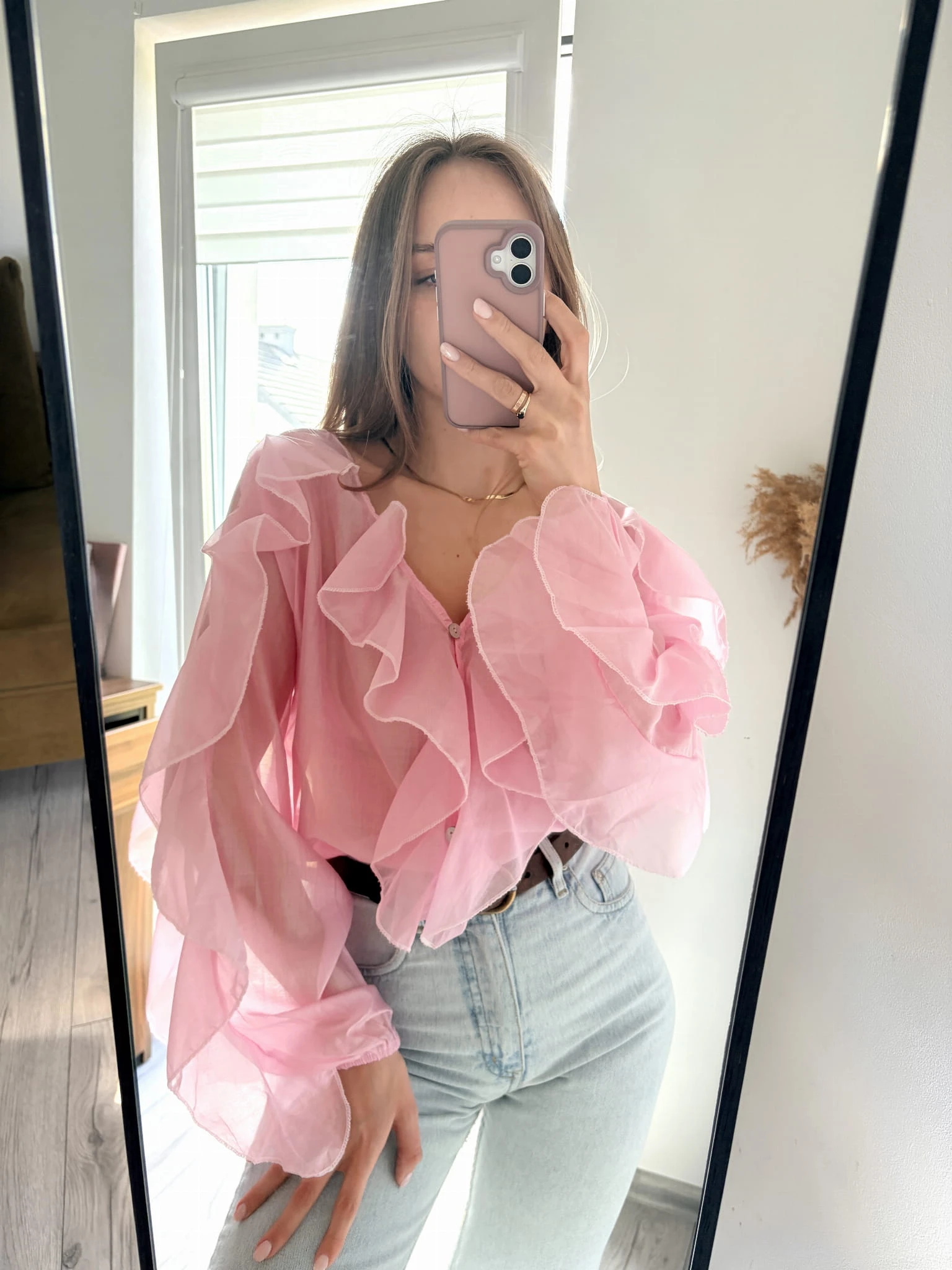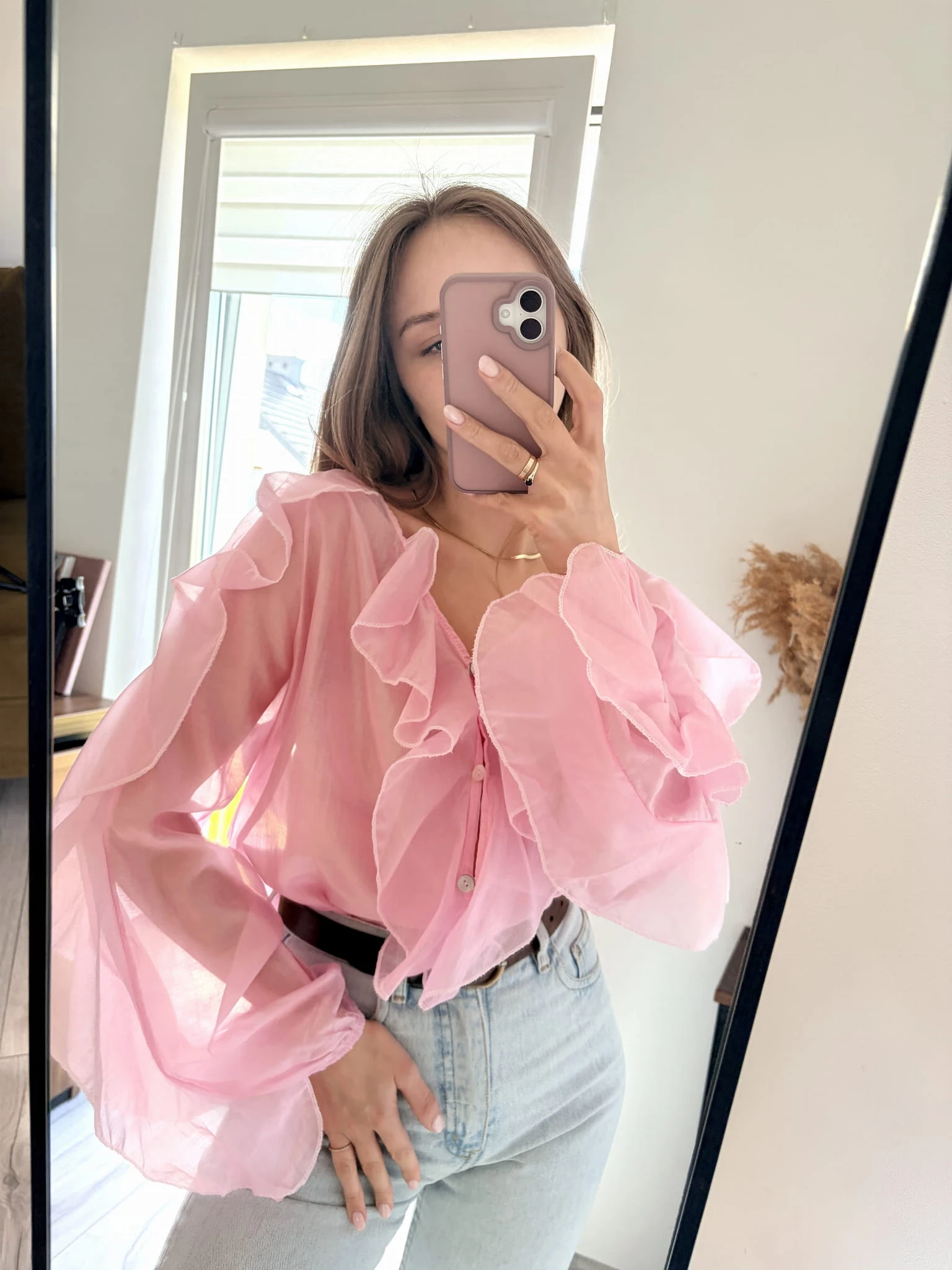 Pudrowo-różowa, delikatna koszula z falbankami, New Collection, rozmiar uniwersalny. Materiał mgiełka.