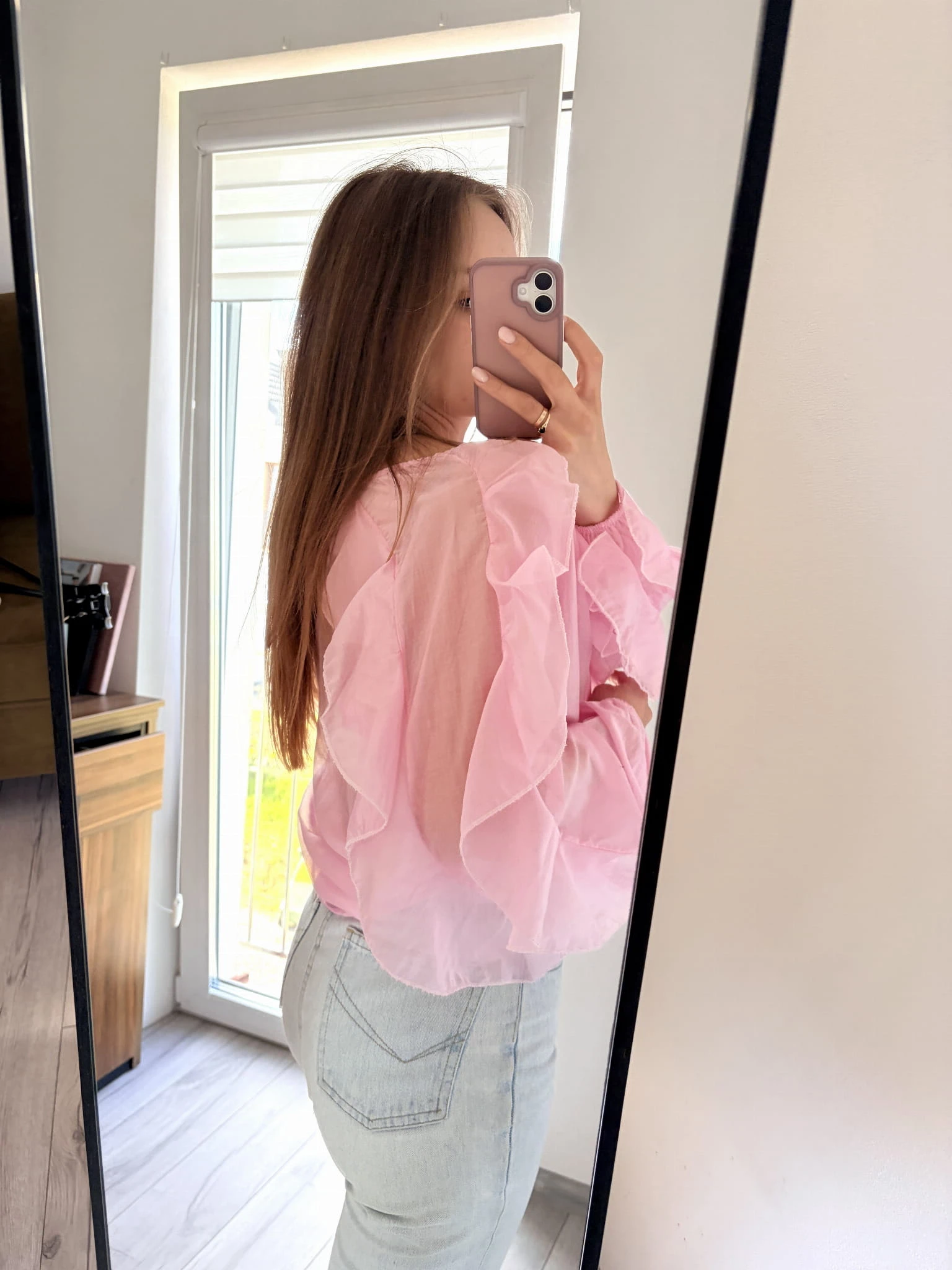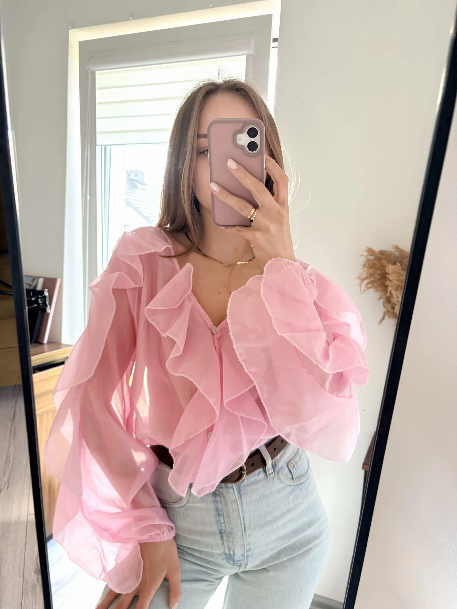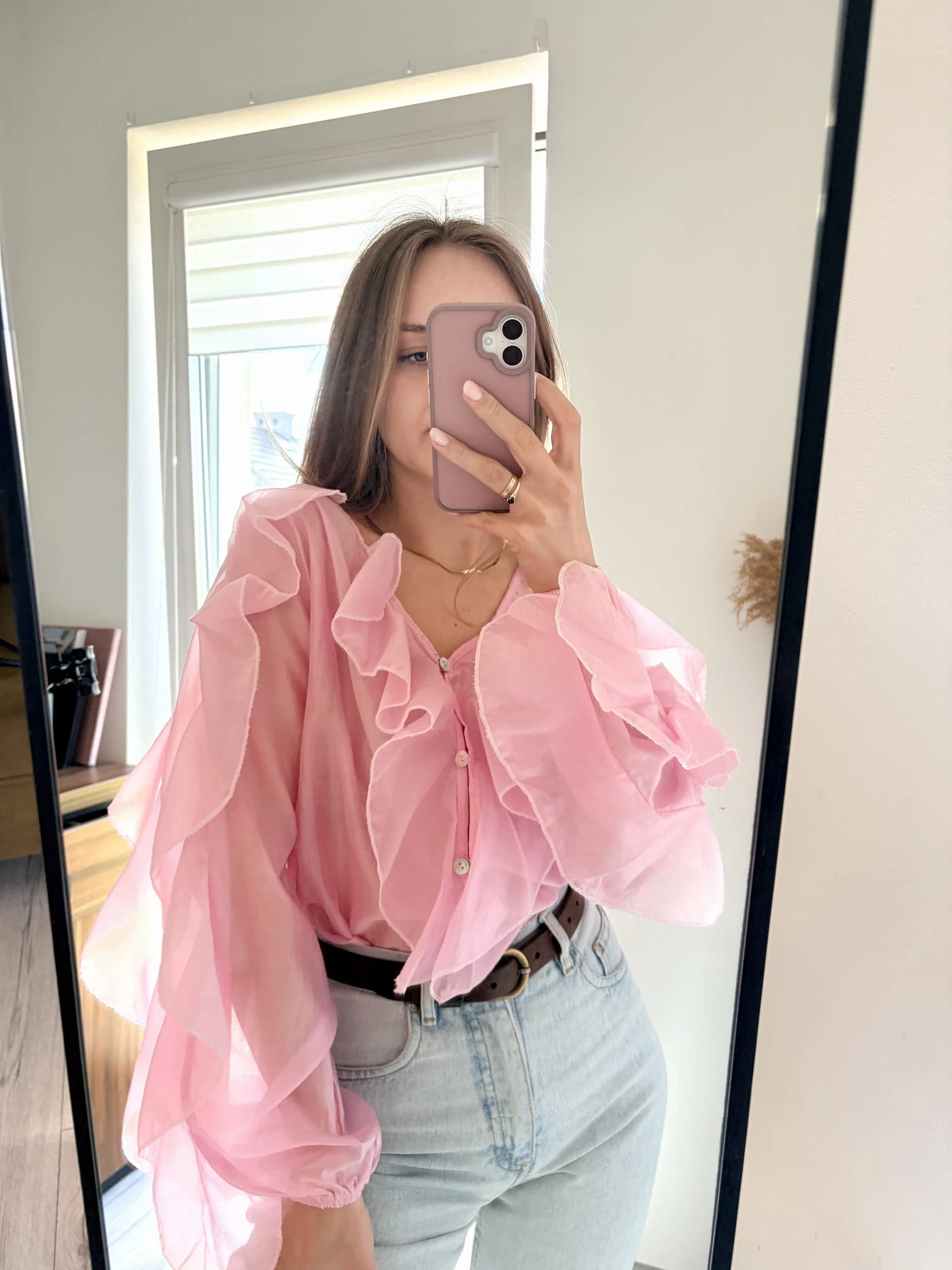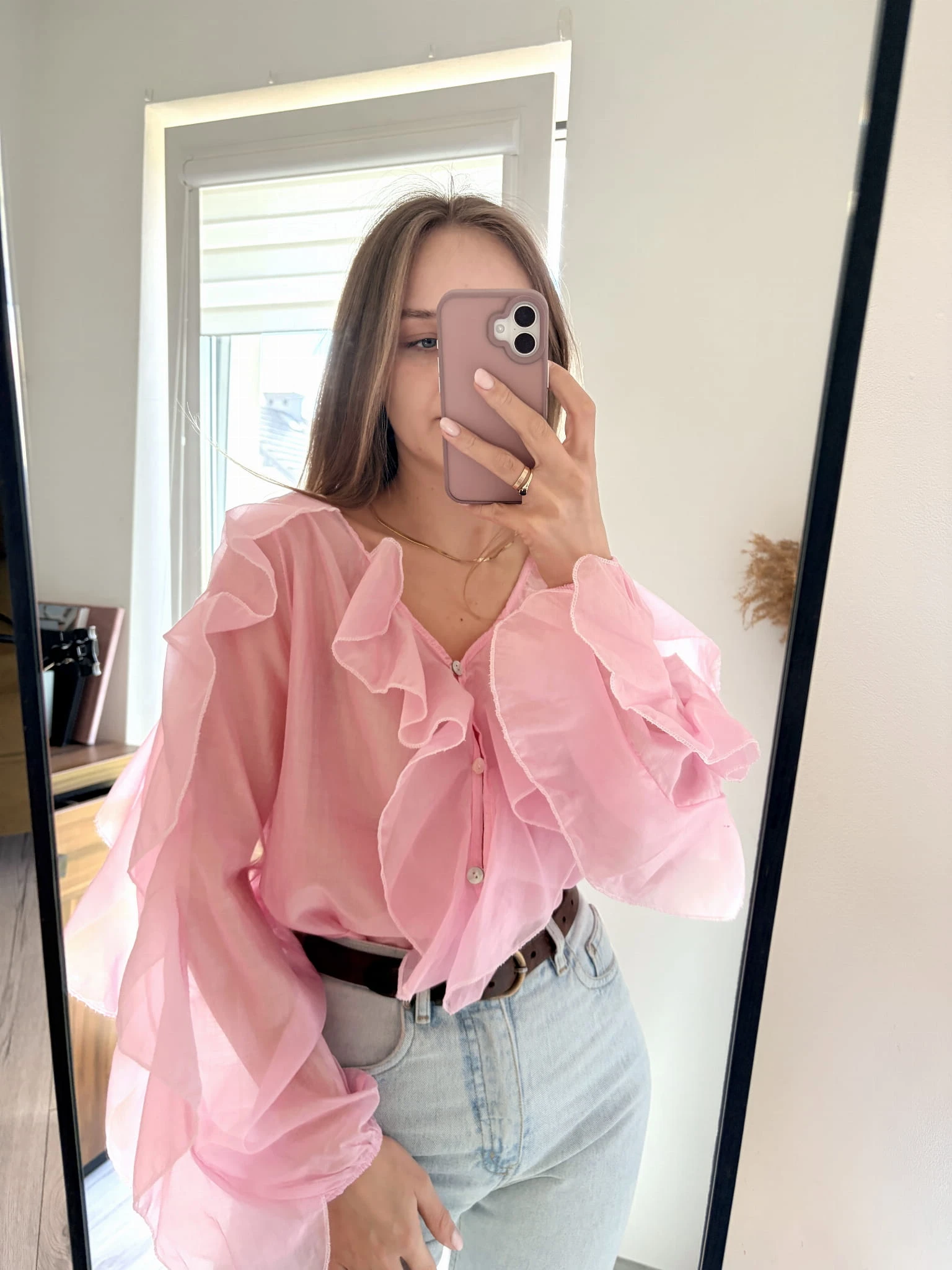Pudrowo-różowa, delikatna koszula z falbankami, New Collection, rozmiar uniwersalny. Materiał mgiełka.