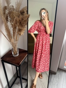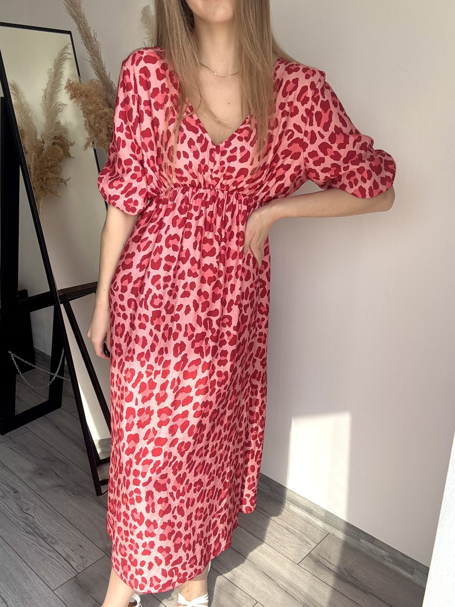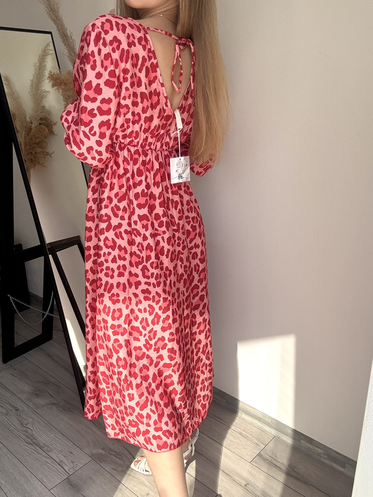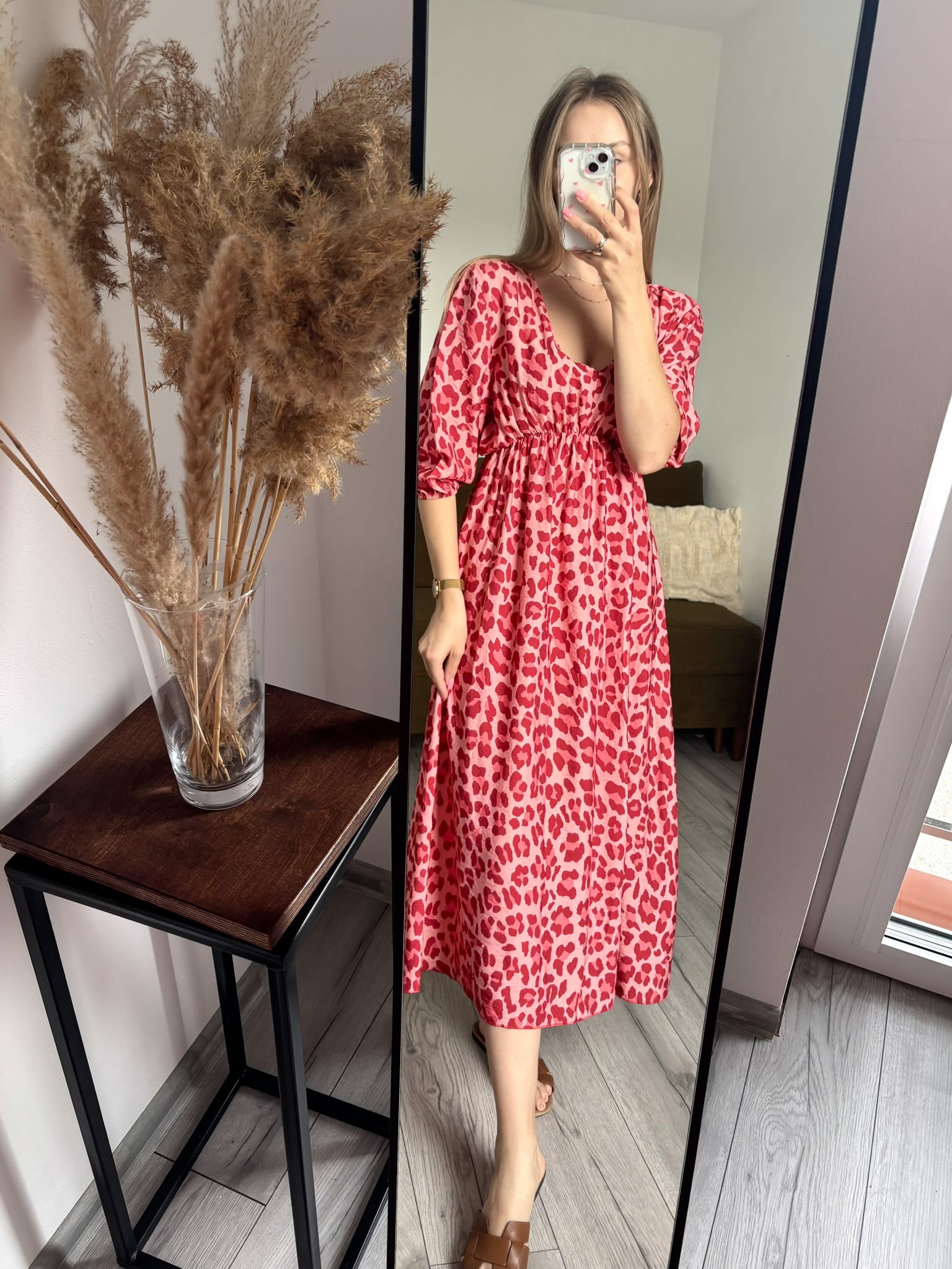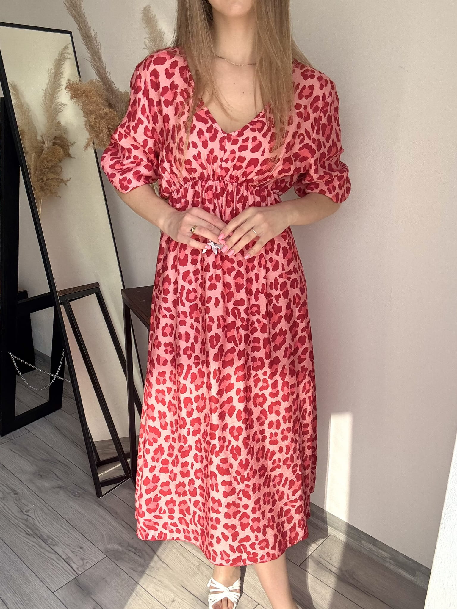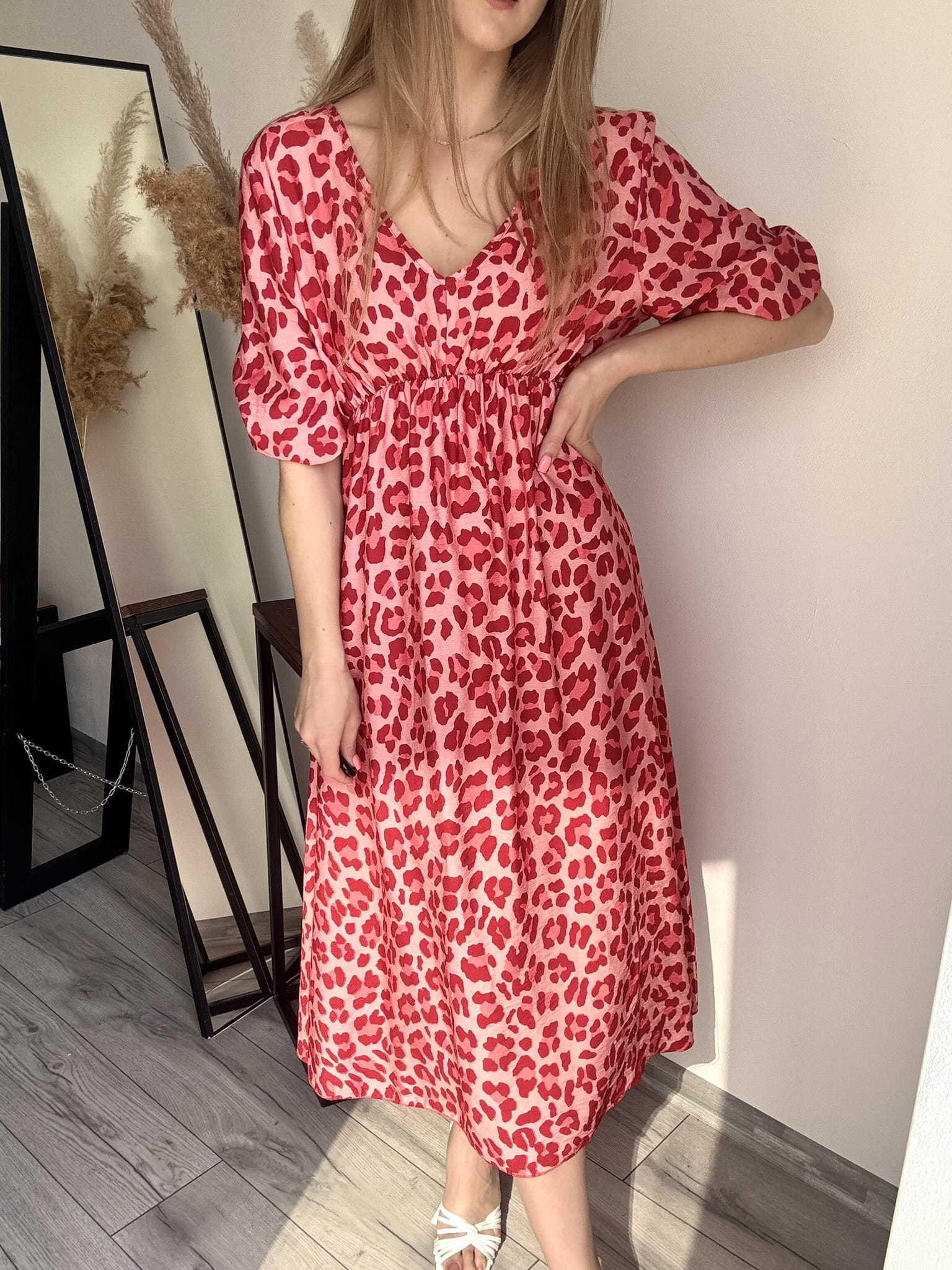 Różowa sukienka w panterkę o długości midi, rozmiar uniwersalny, z bufiastym 3/4 rękawem.