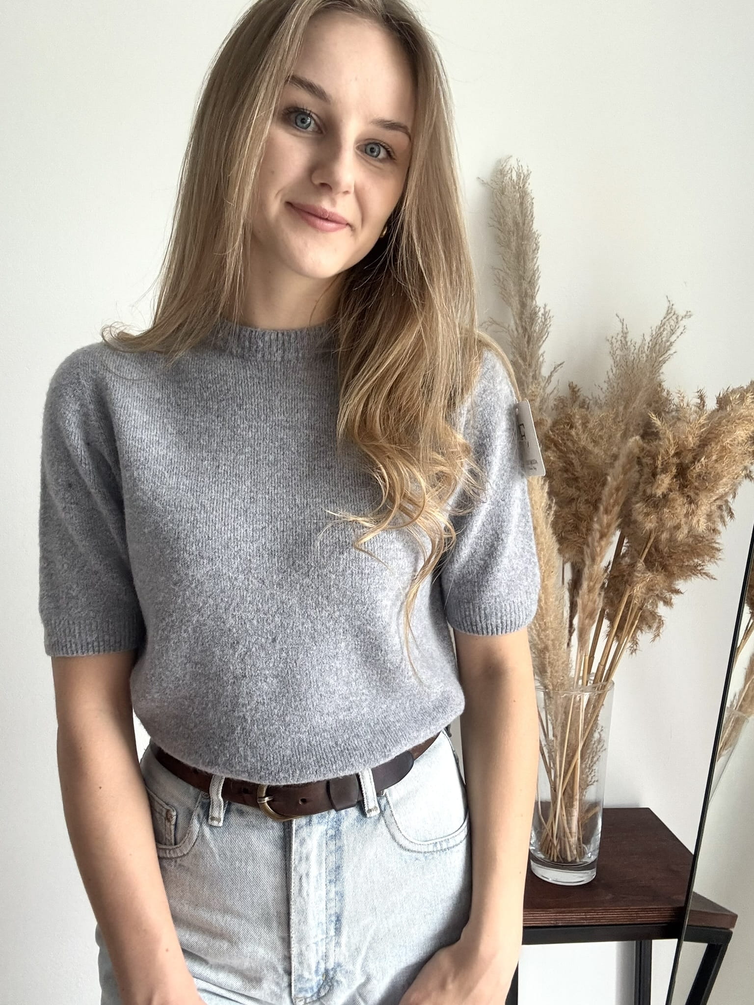 Szary mięciutki sweterek z krótkim rękawem Baby Alpaka w rozmiarze uniwersalnym.