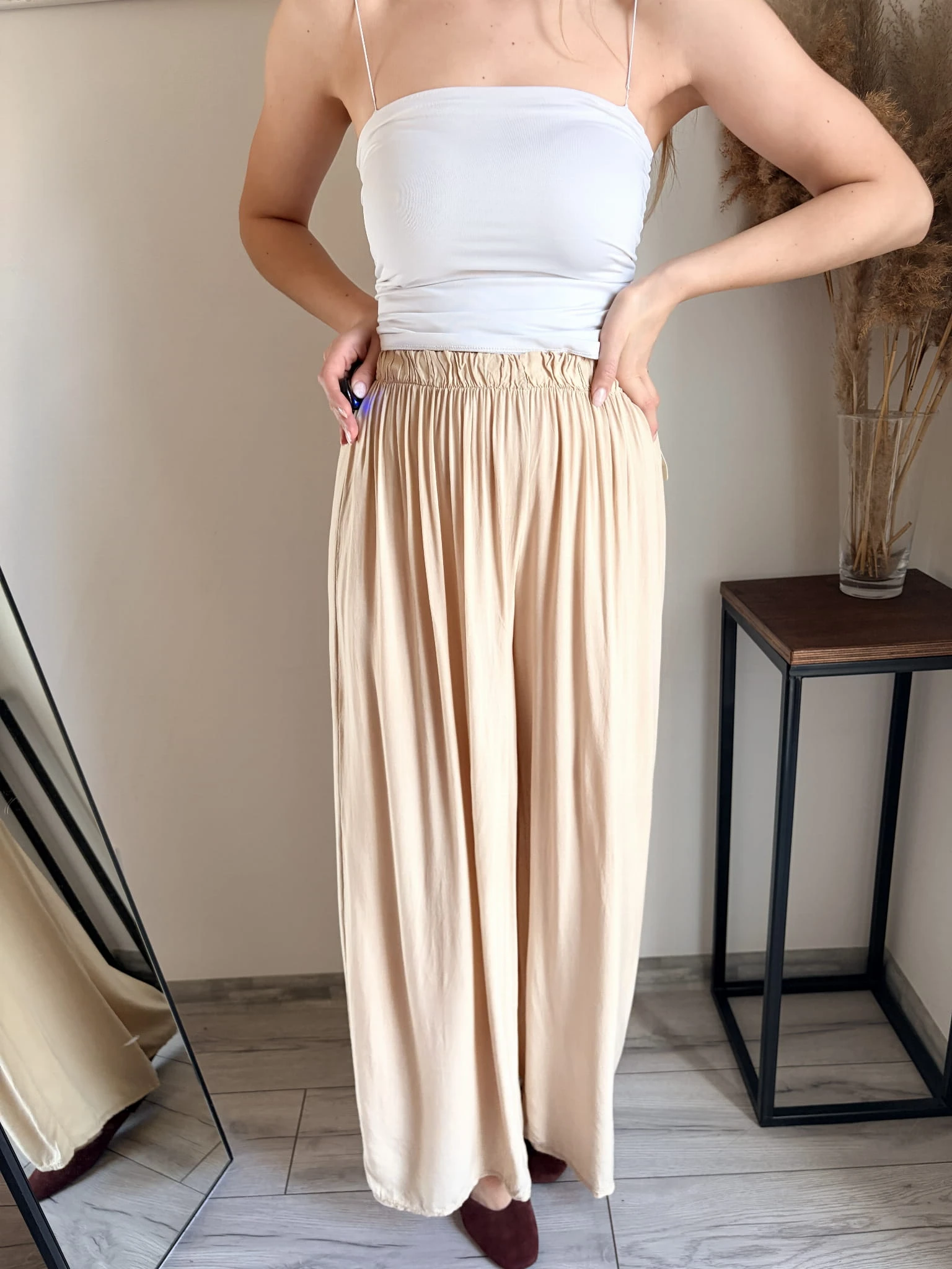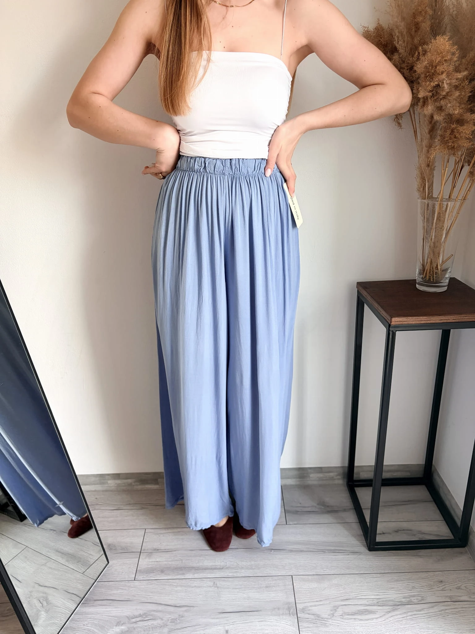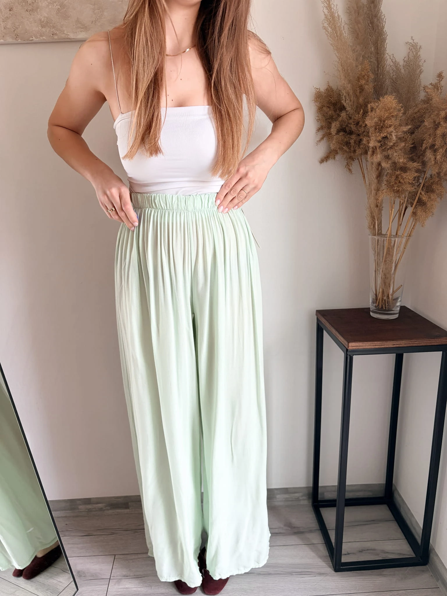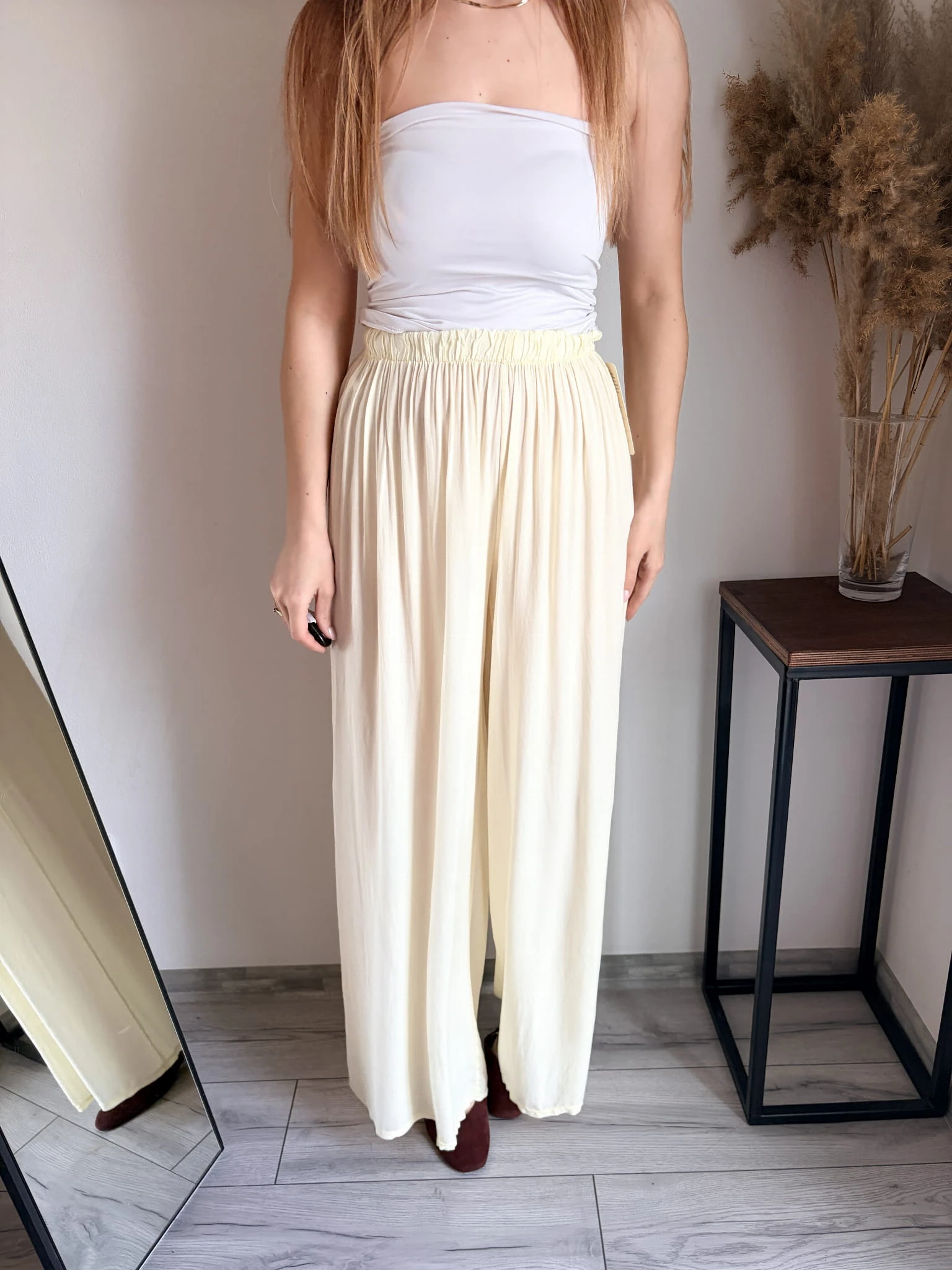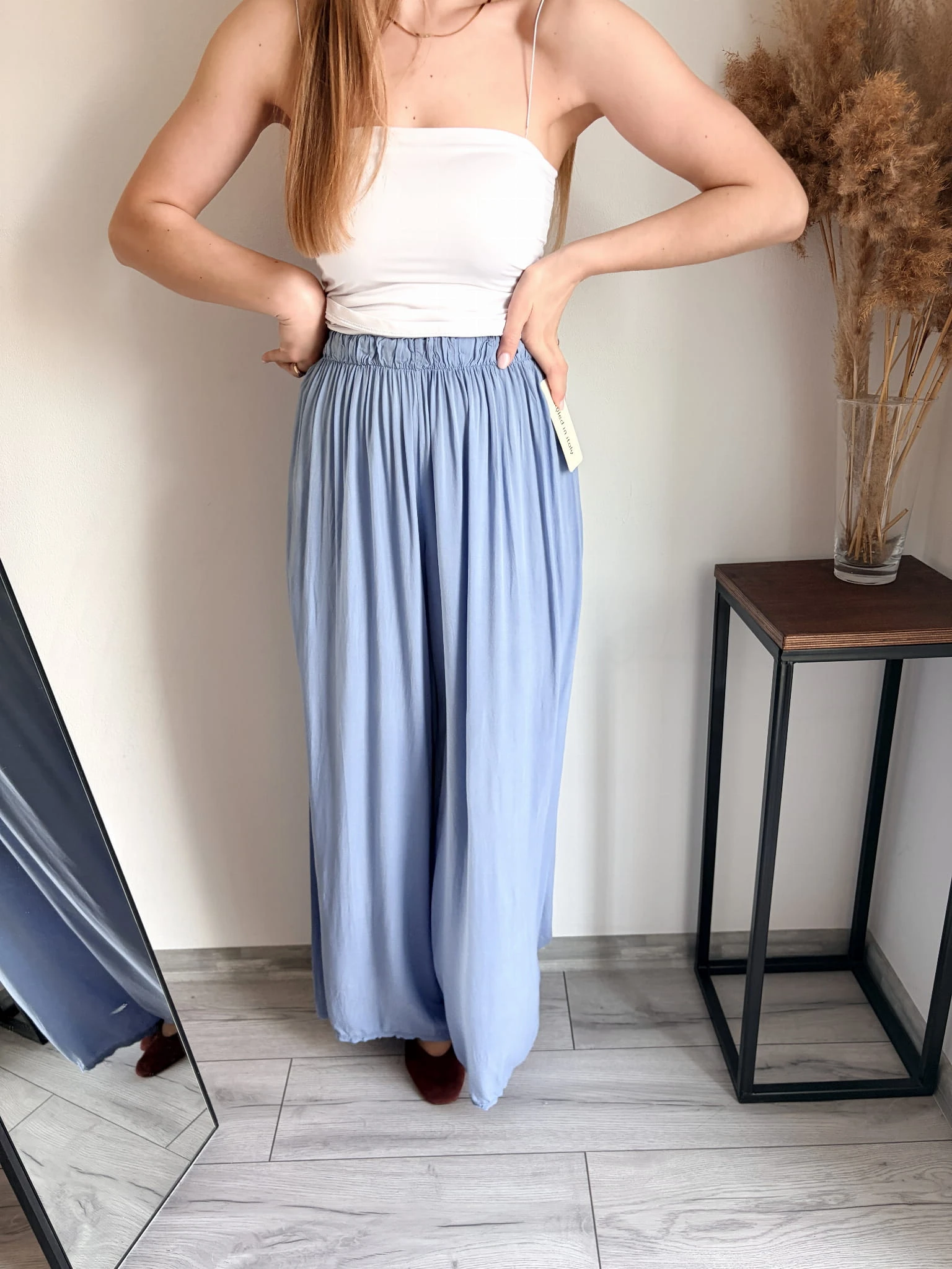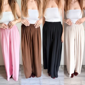 Szerokie spodnie letnie z cienkiej wiskozy, idealne na cieplejsze dni. Marka Styled in Italy, rozmiar uniwersalny. W pasie gumka. Dostępne w kilku kolorach.