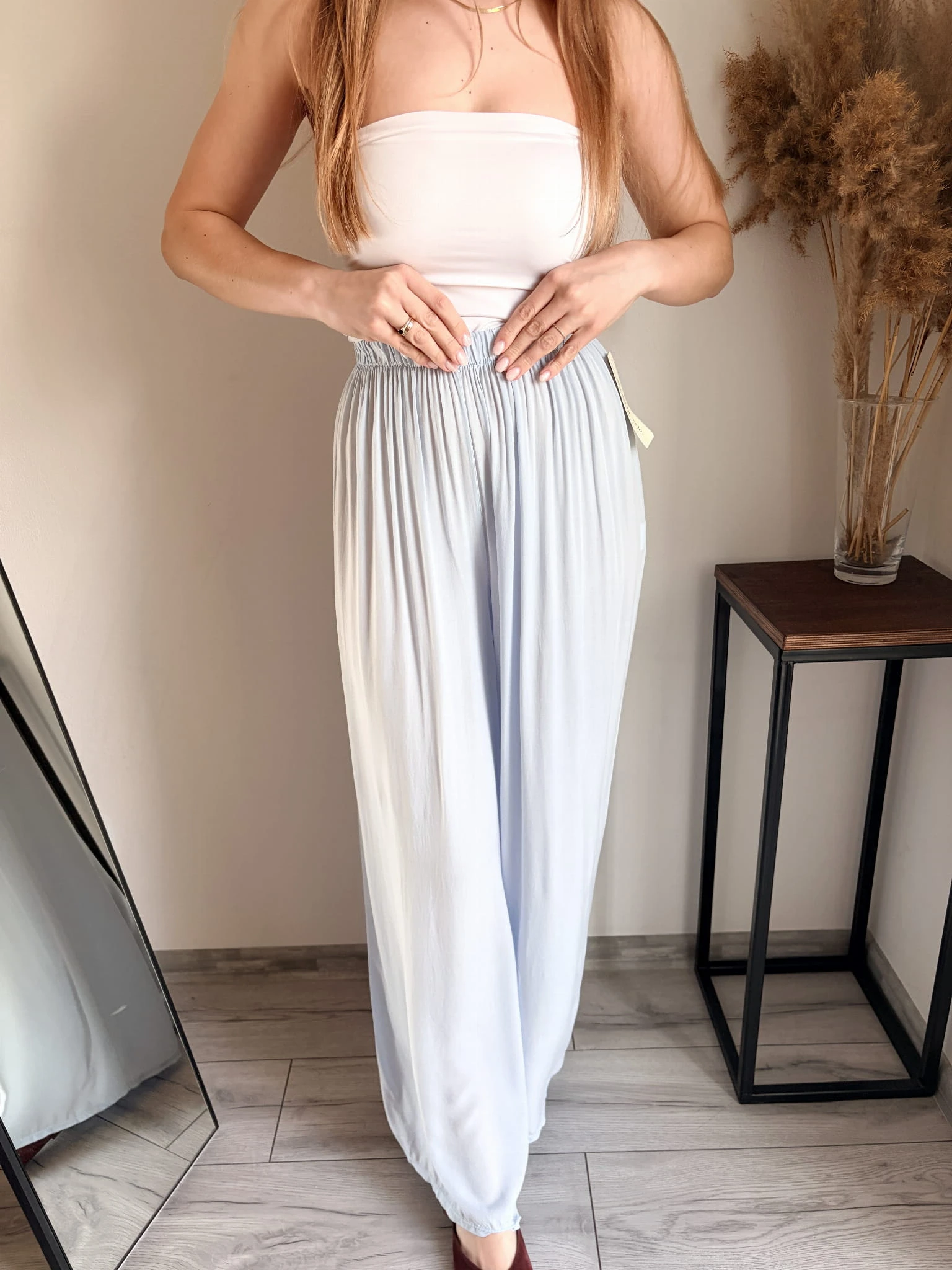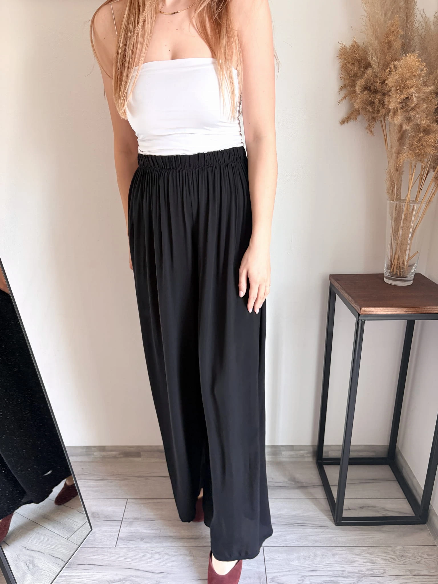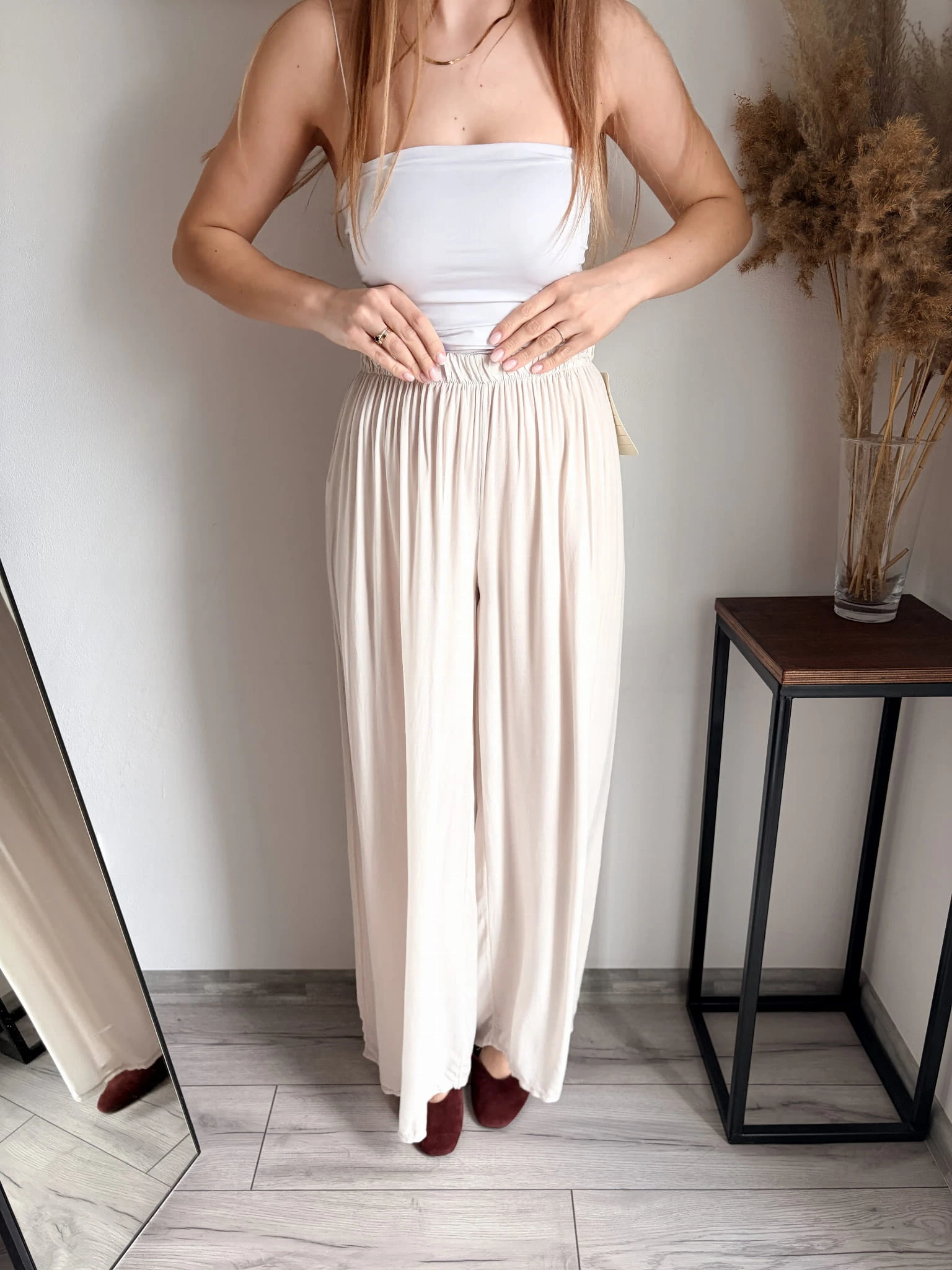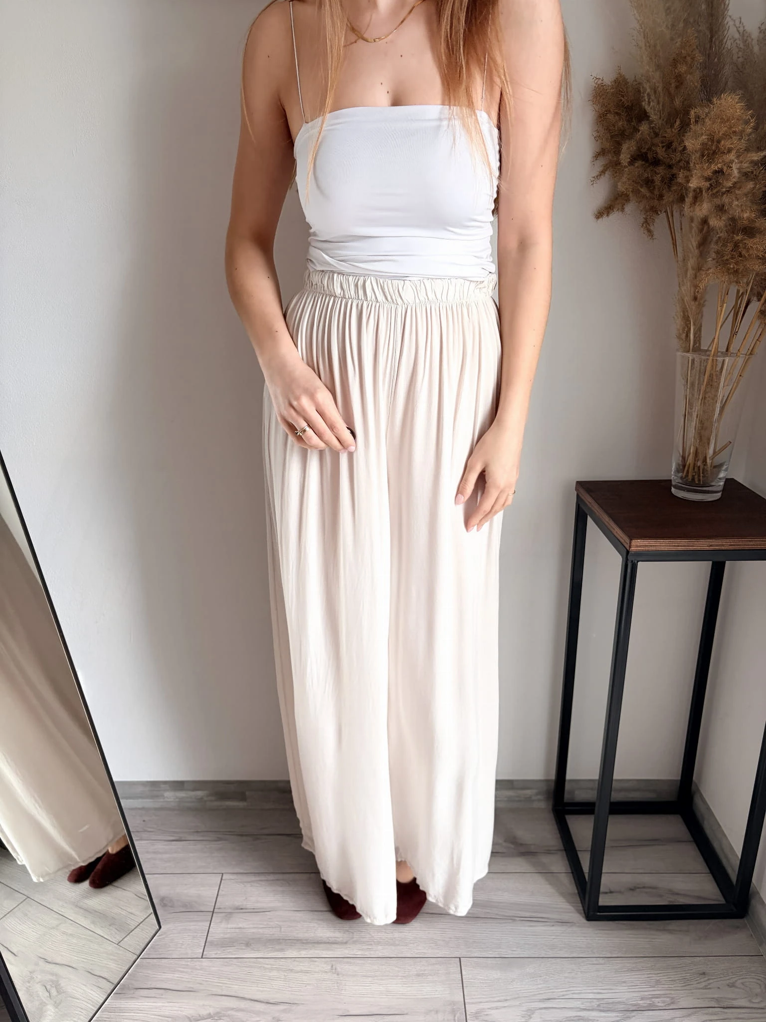Szerokie spodnie letnie z cienkiej wiskozy, idealne na cieplejsze dni. Marka Styled in Italy, rozmiar uniwersalny. W pasie gumka. Dostępne w kilku kolorach.