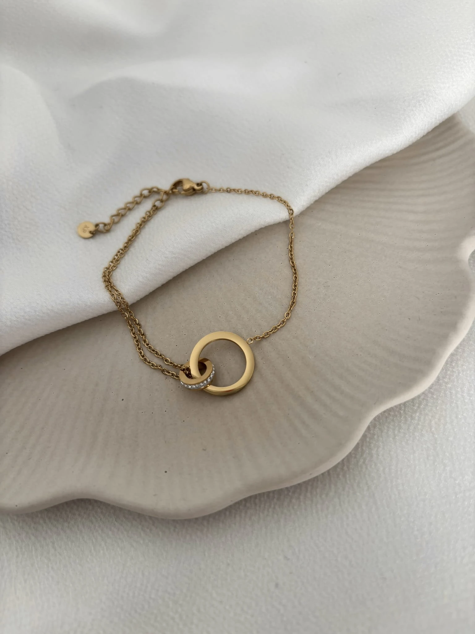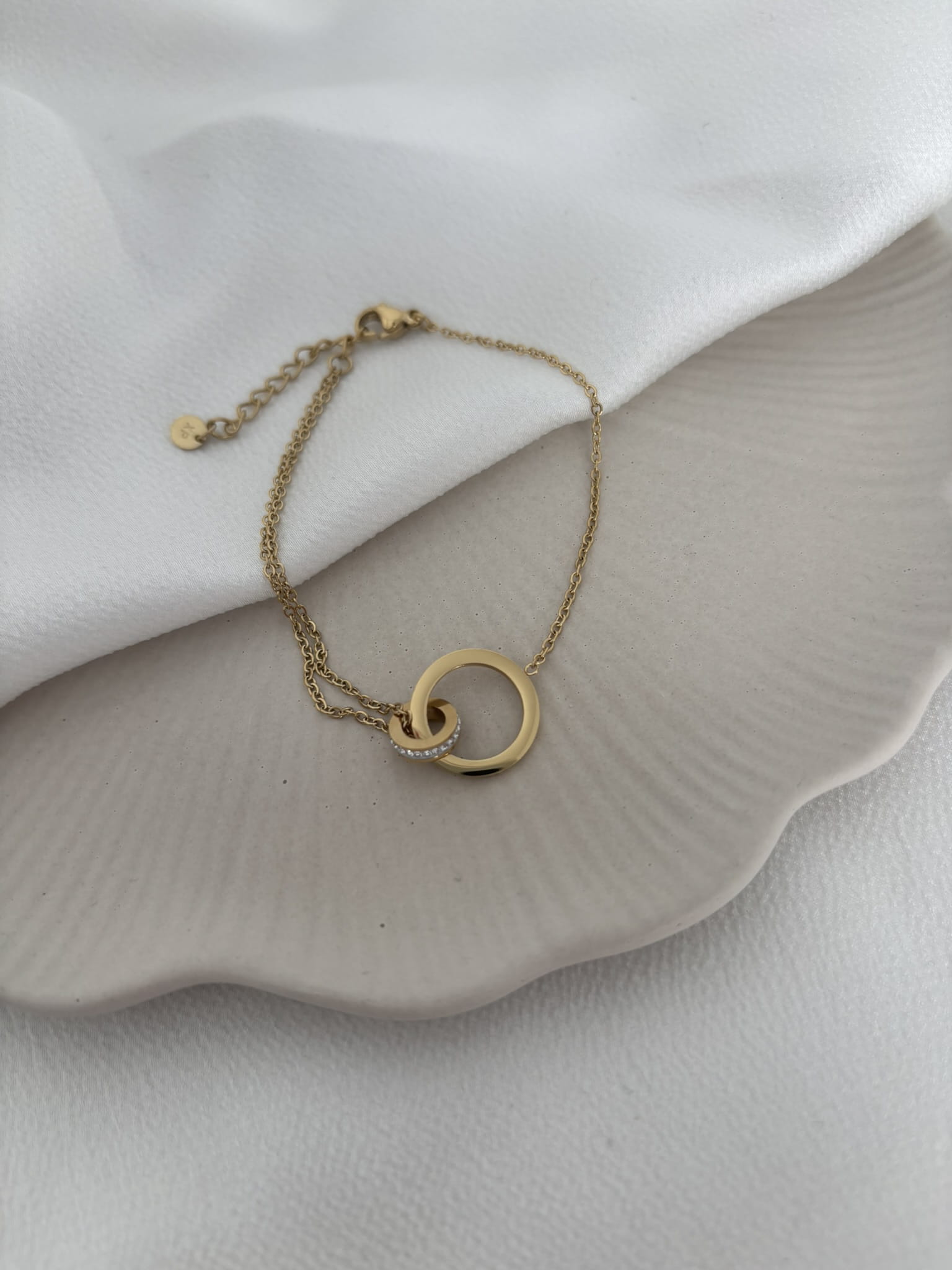 Delikatna złota bransoletka z zaplatanymi kółeczkami, wykonana ze stali chirurgicznej.