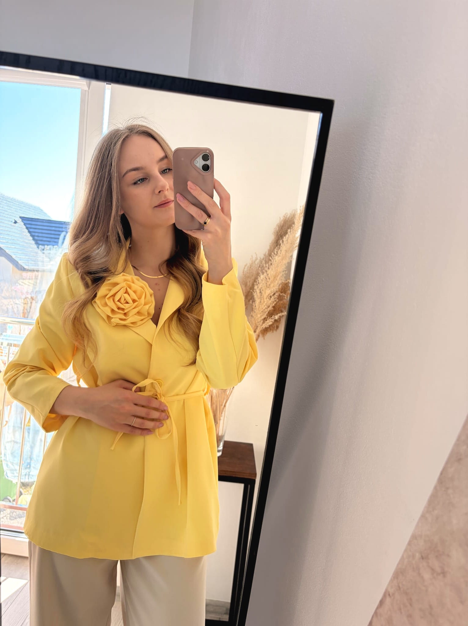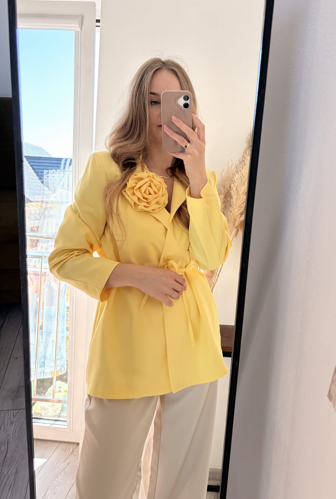 Żółta dłuższa marynarka z paskiem i kwiatem, New Collection, rozmiar uniwersalny