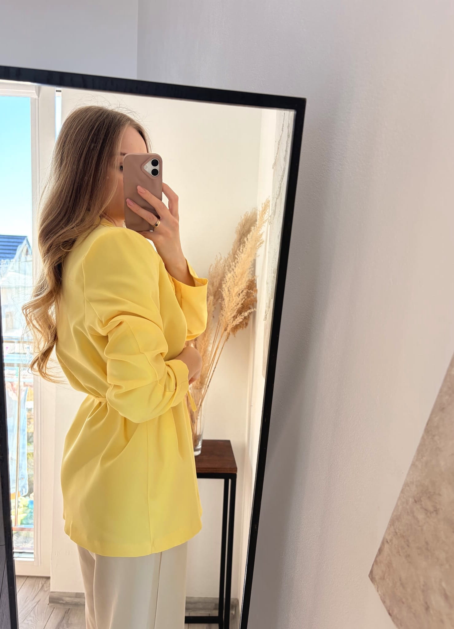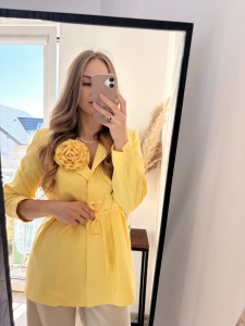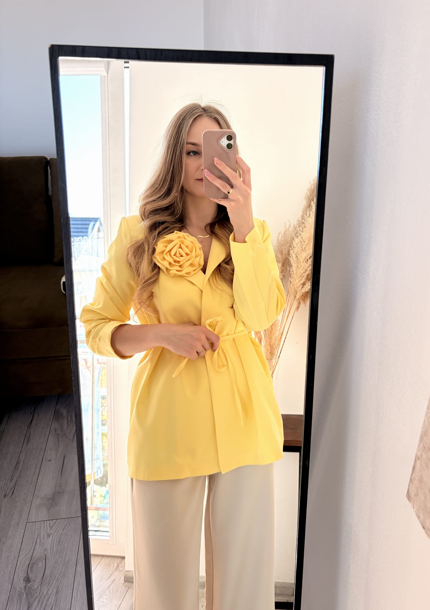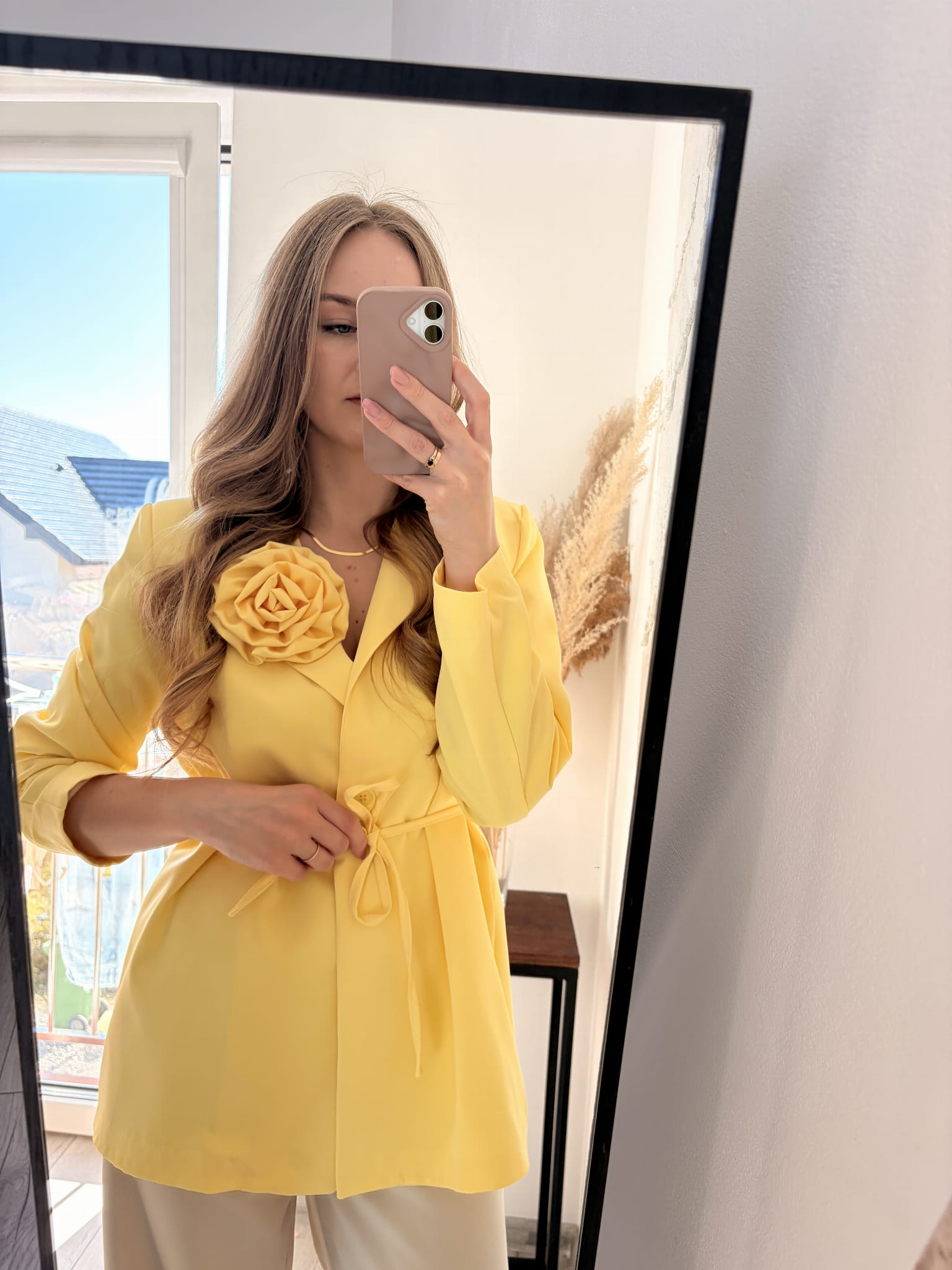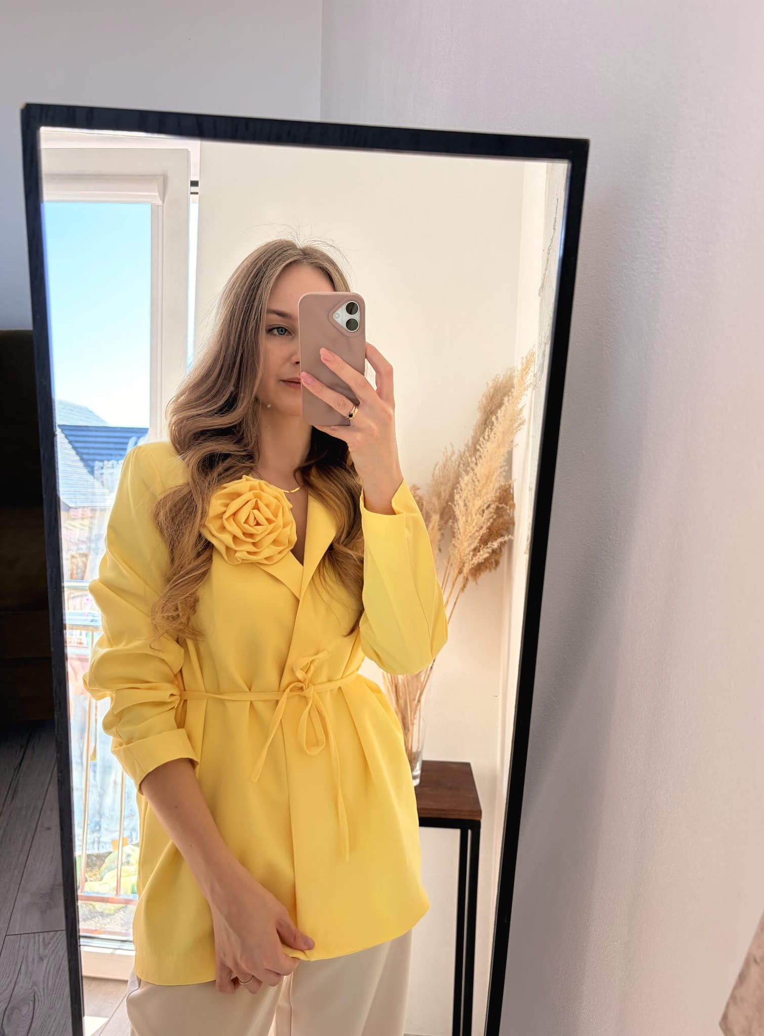Żółta dłuższa marynarka z paskiem i kwiatem, New Collection, rozmiar uniwersalny. Kwiat można przepiąć w dowolne miejsce.