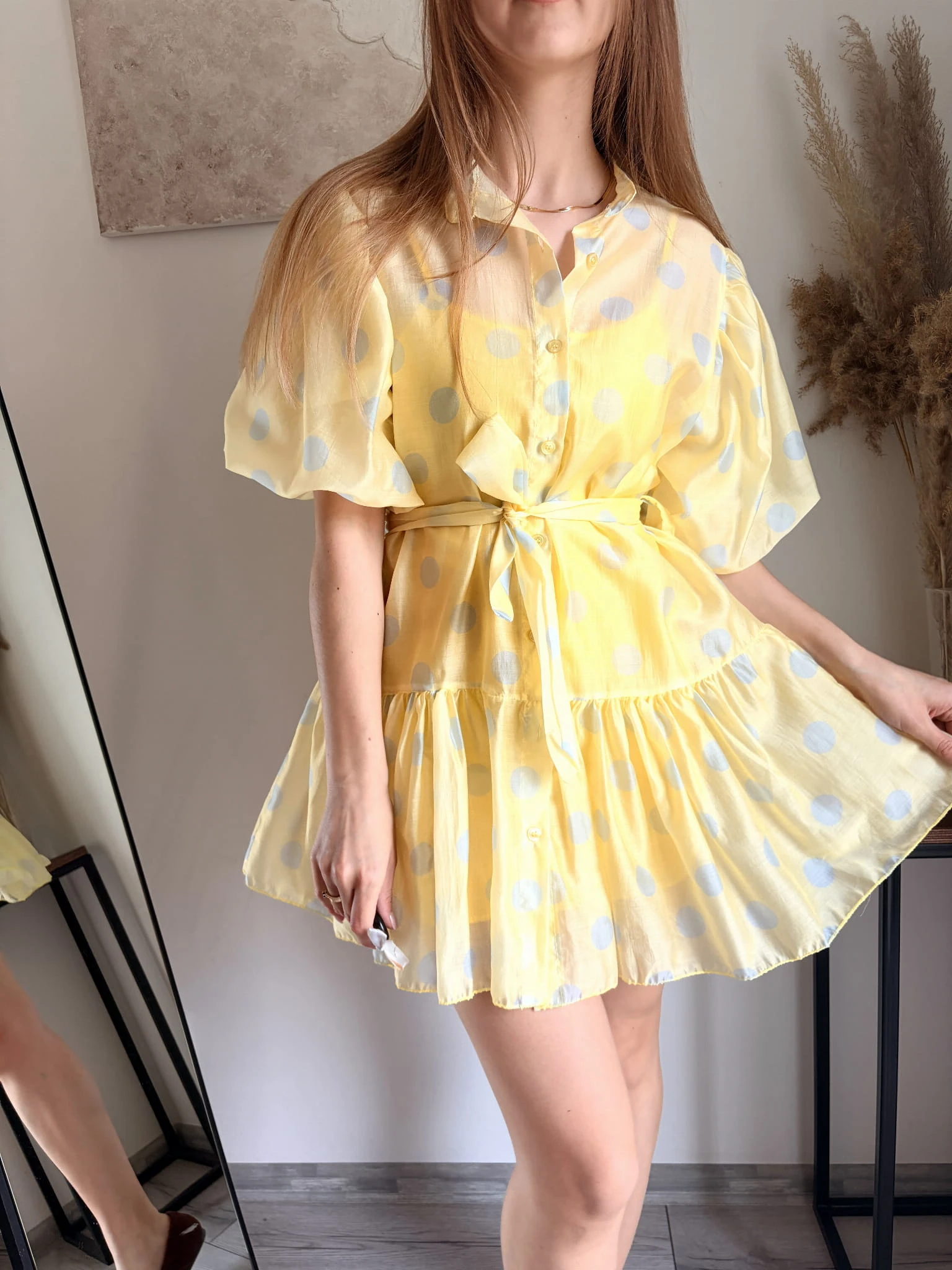 Żółta sukienka w niebieskie grochy, groszki mini na komunię chrzciny La Look. Sukienka ma bufki na rękawach, jest wiązana w pasie. Ma podszewkę.